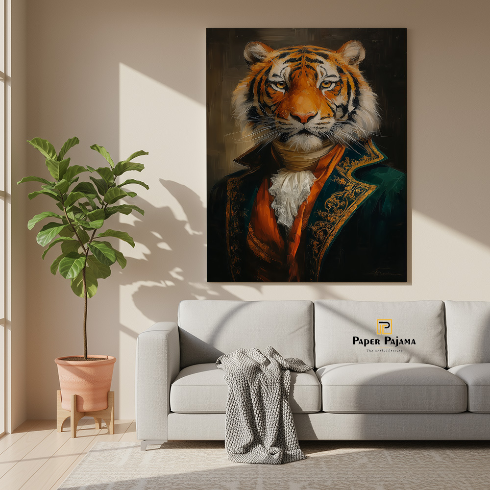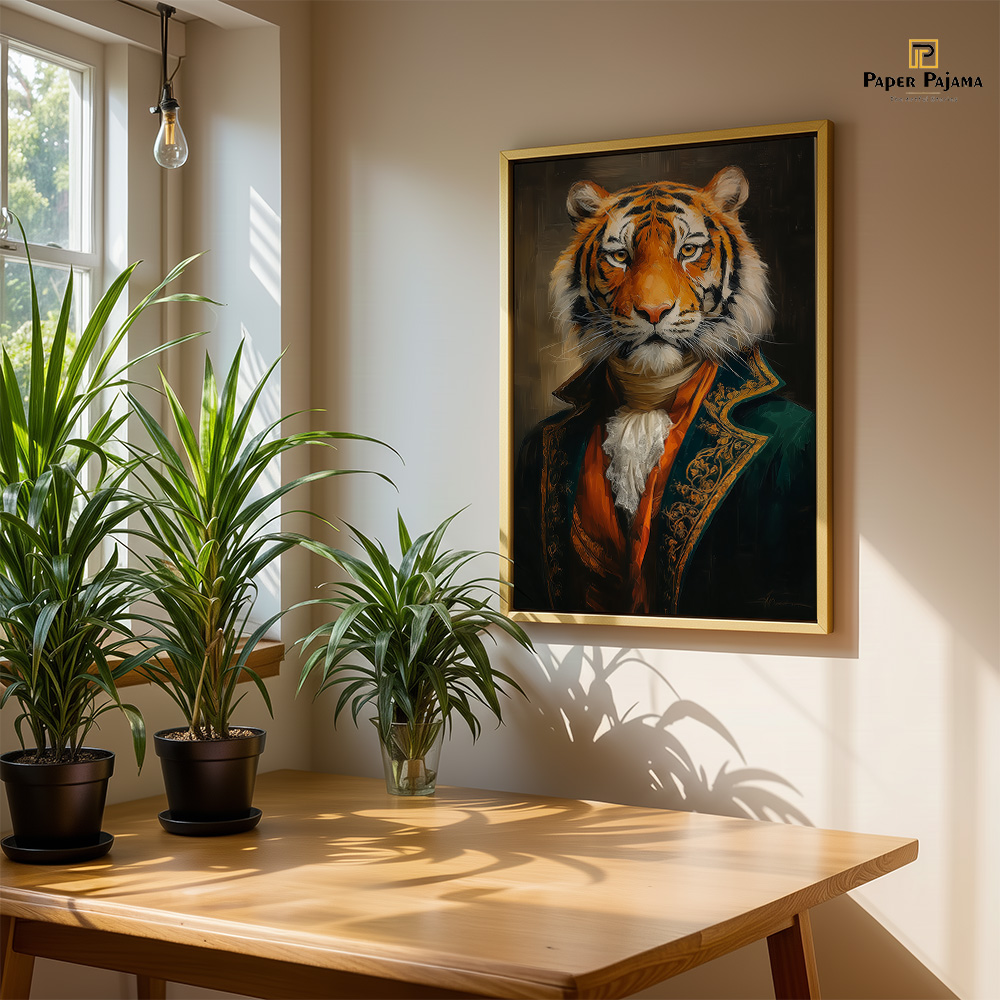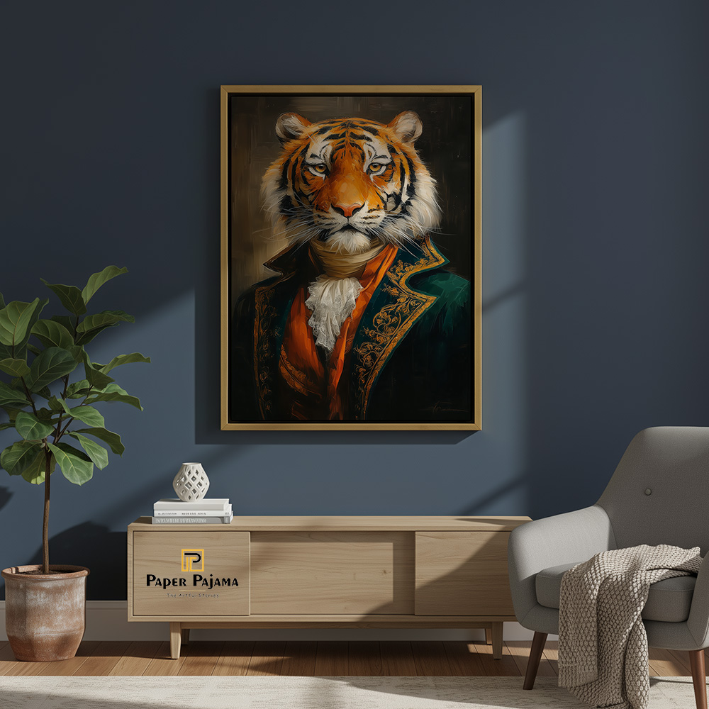 Baagh Nawaab is a striking celebration of quiet power and refined authority. This premium printed artwork presents a regal tiger, poised and composed, dressed in aristocratic attire that blends raw wilderness with timeless nobility. Against a deep, dramatic backdrop, the gaze commands attention—calm, confident, and unmistakably dominant.