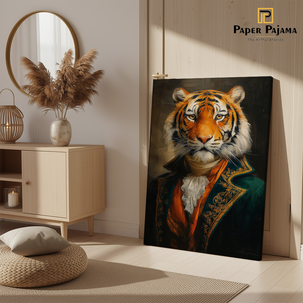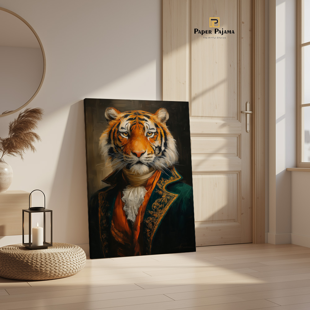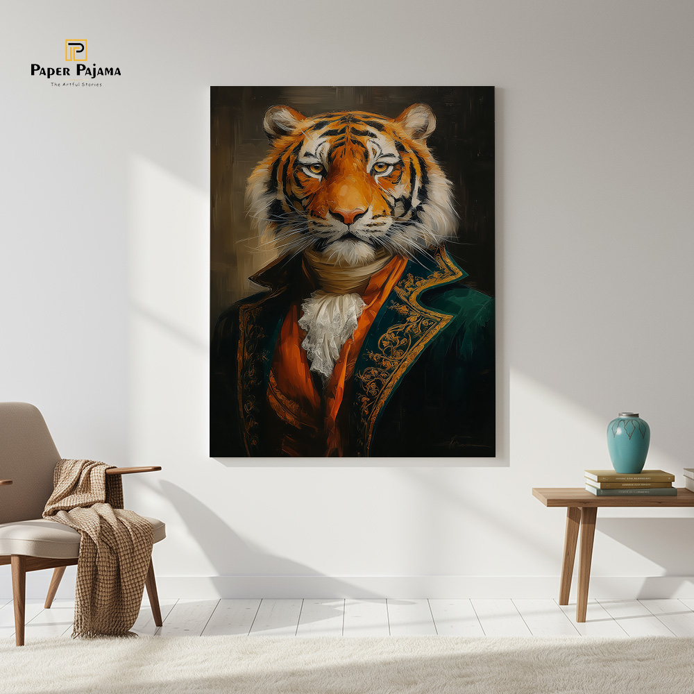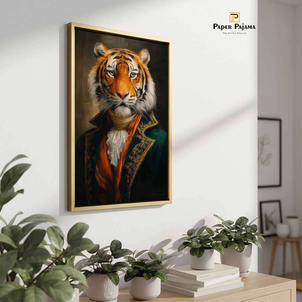 Baagh Nawaab is a striking celebration of quiet power and refined authority. This premium printed artwork presents a regal tiger, poised and composed, dressed in aristocratic attire that blends raw wilderness with timeless nobility. Against a deep, dramatic backdrop, the gaze commands attention—calm, confident, and unmistakably dominant.