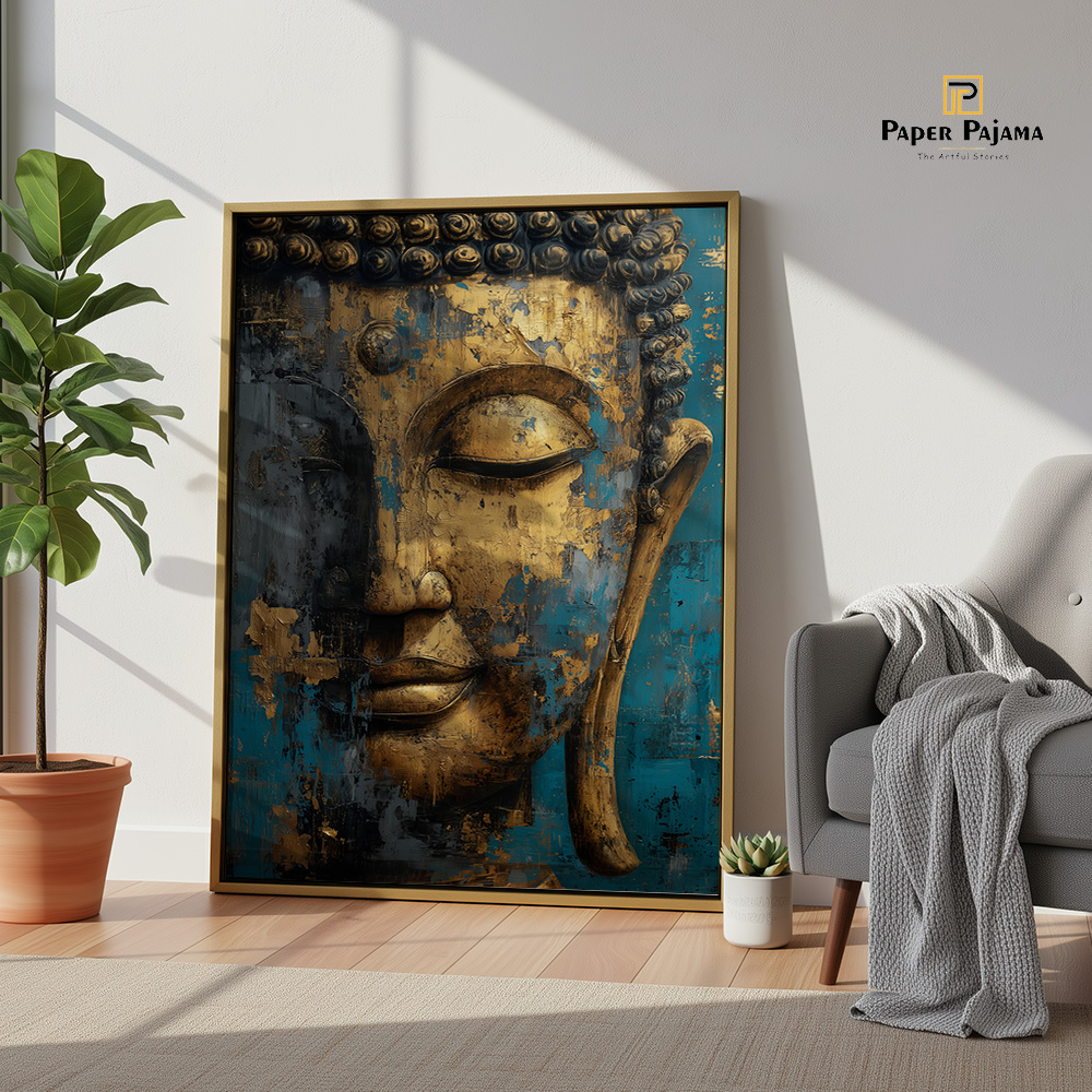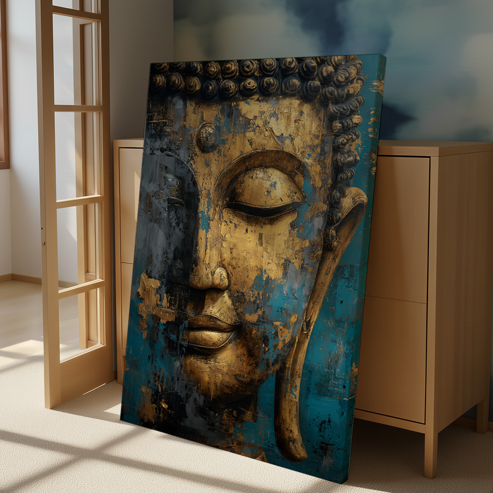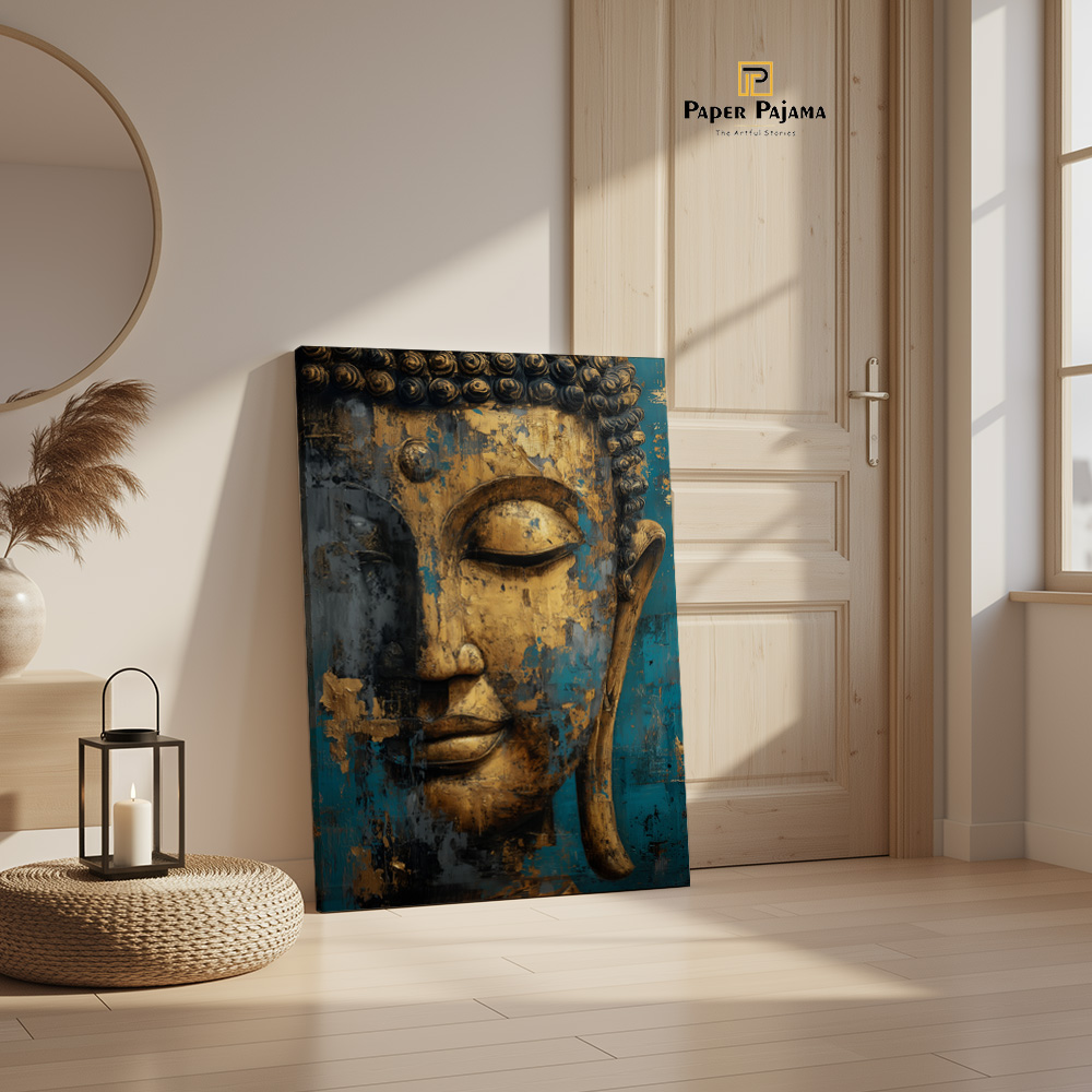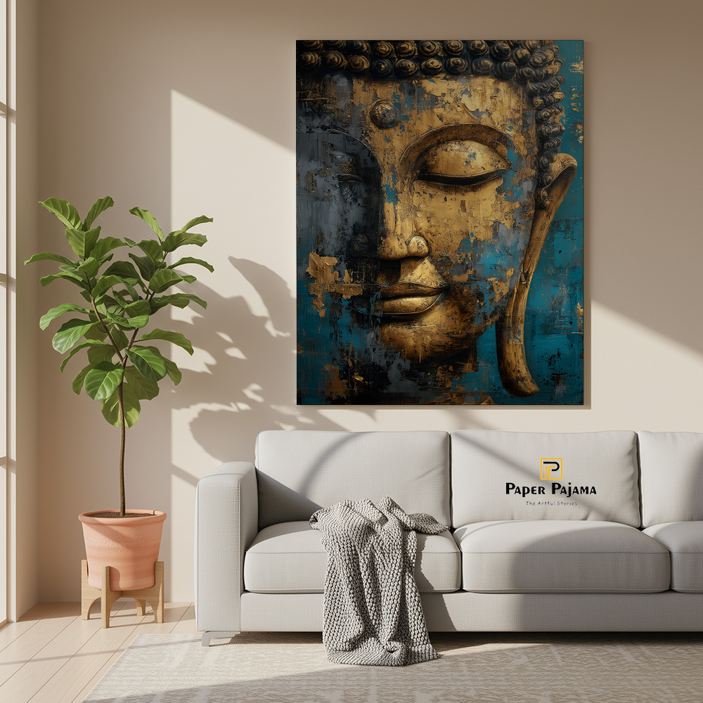 Bodhavi is a visual meditation on stillness and awakening. This refined printed artwork presents a serene Buddha visage, where closed eyes and softened contours invite quiet reflection. The interplay of aged gold tones with deep teal and layered textures creates a sense of timeless calm, as if wisdom itself has been gently weathered by time.