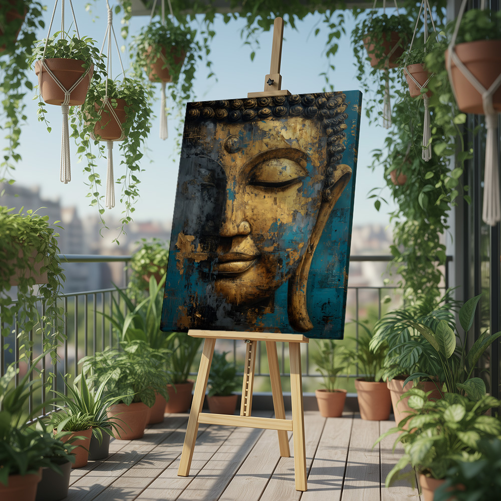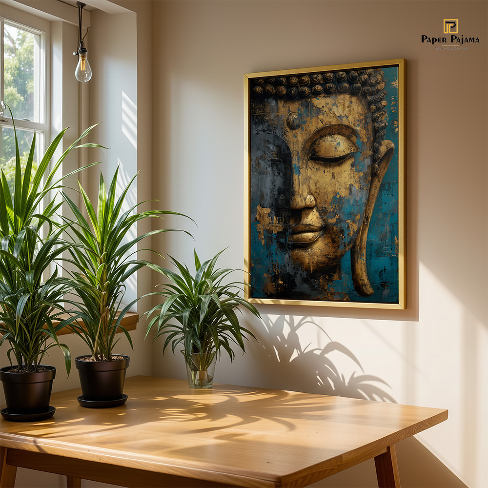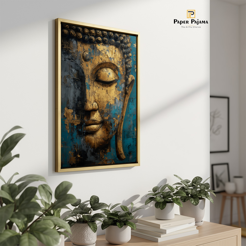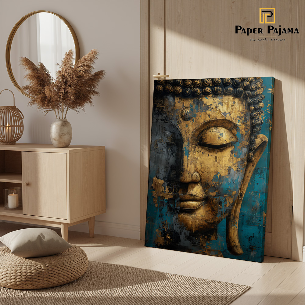 Bodhavi is a visual meditation on stillness and awakening. This refined printed artwork presents a serene Buddha visage, where closed eyes and softened contours invite quiet reflection. The interplay of aged gold tones with deep teal and layered textures creates a sense of timeless calm, as if wisdom itself has been gently weathered by time.