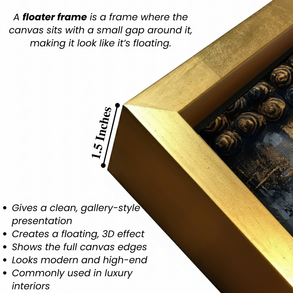 - Optional Floater Framing: Available with a premium floater frame option that creates a subtle gap between the canvas and the outer frame, enhancing depth and giving the artwork a refined, gallery-style floating effect that elevates its visual appeal.