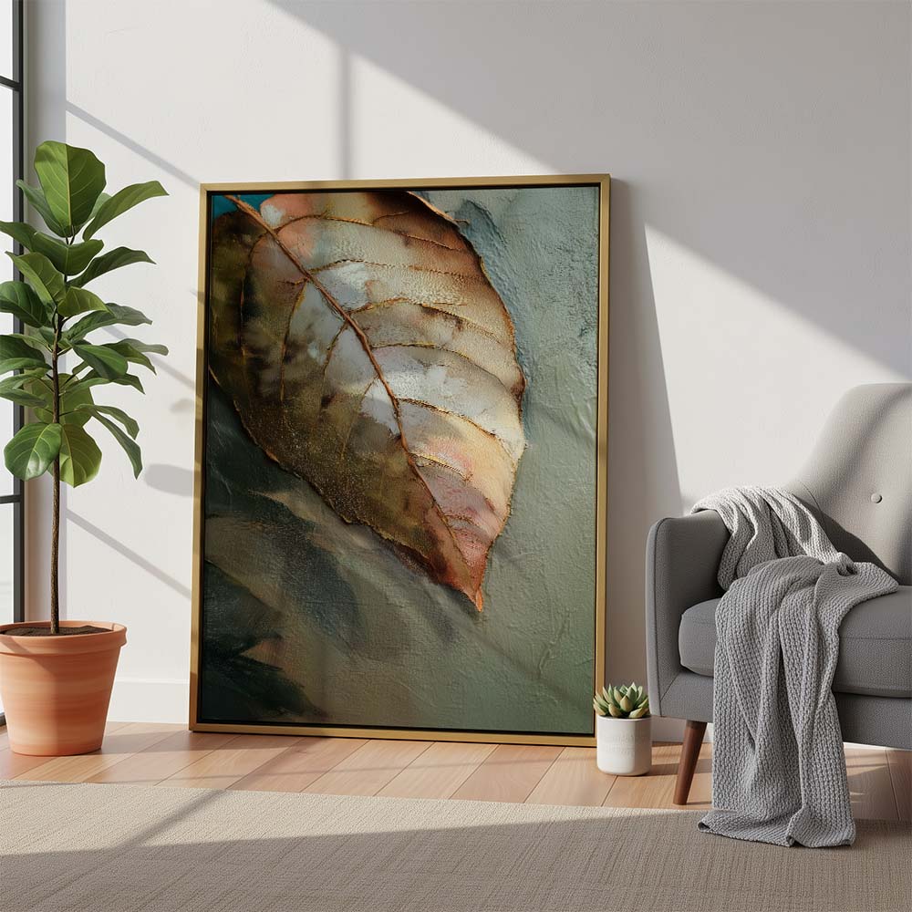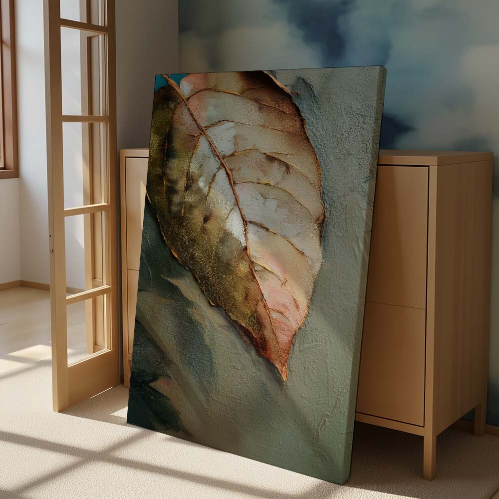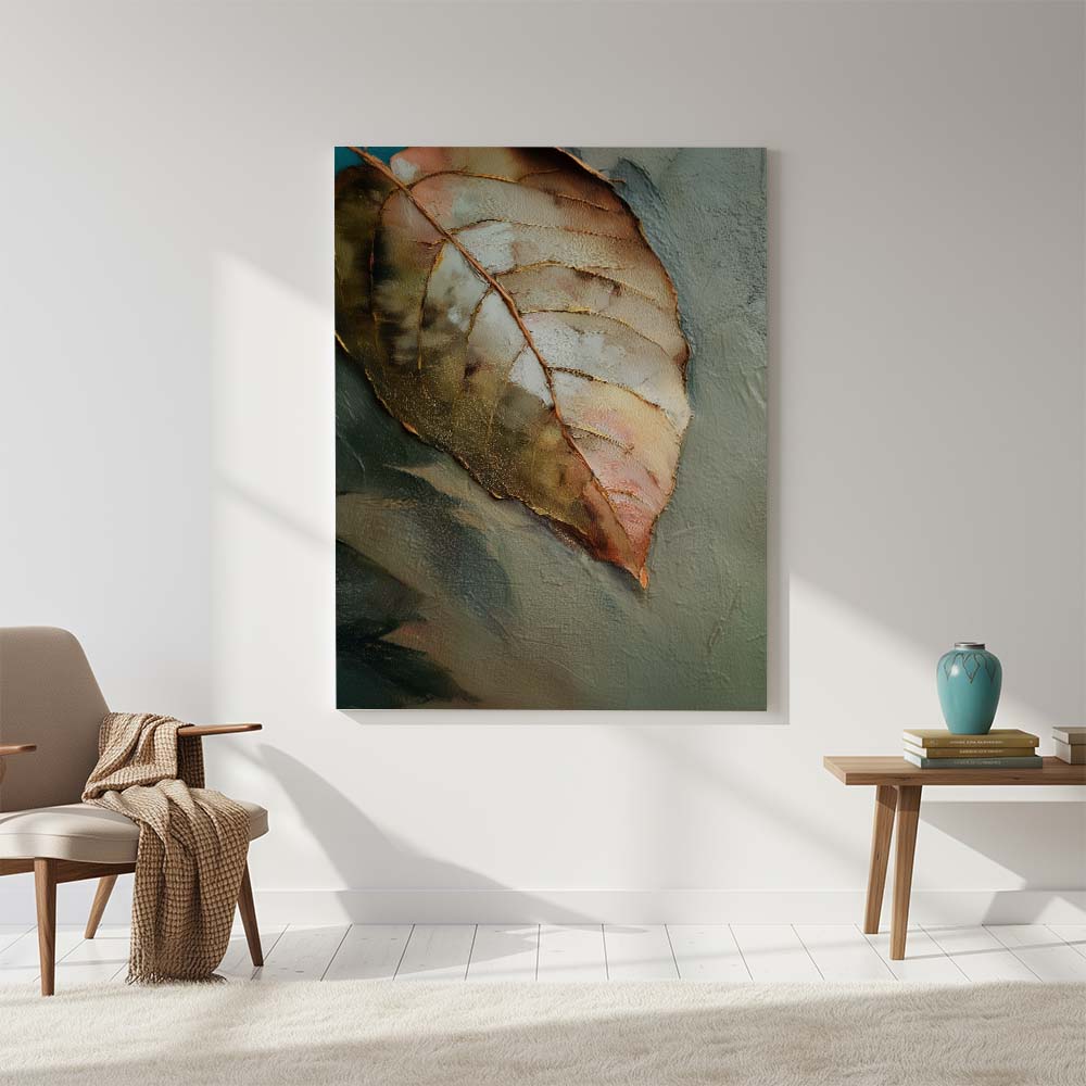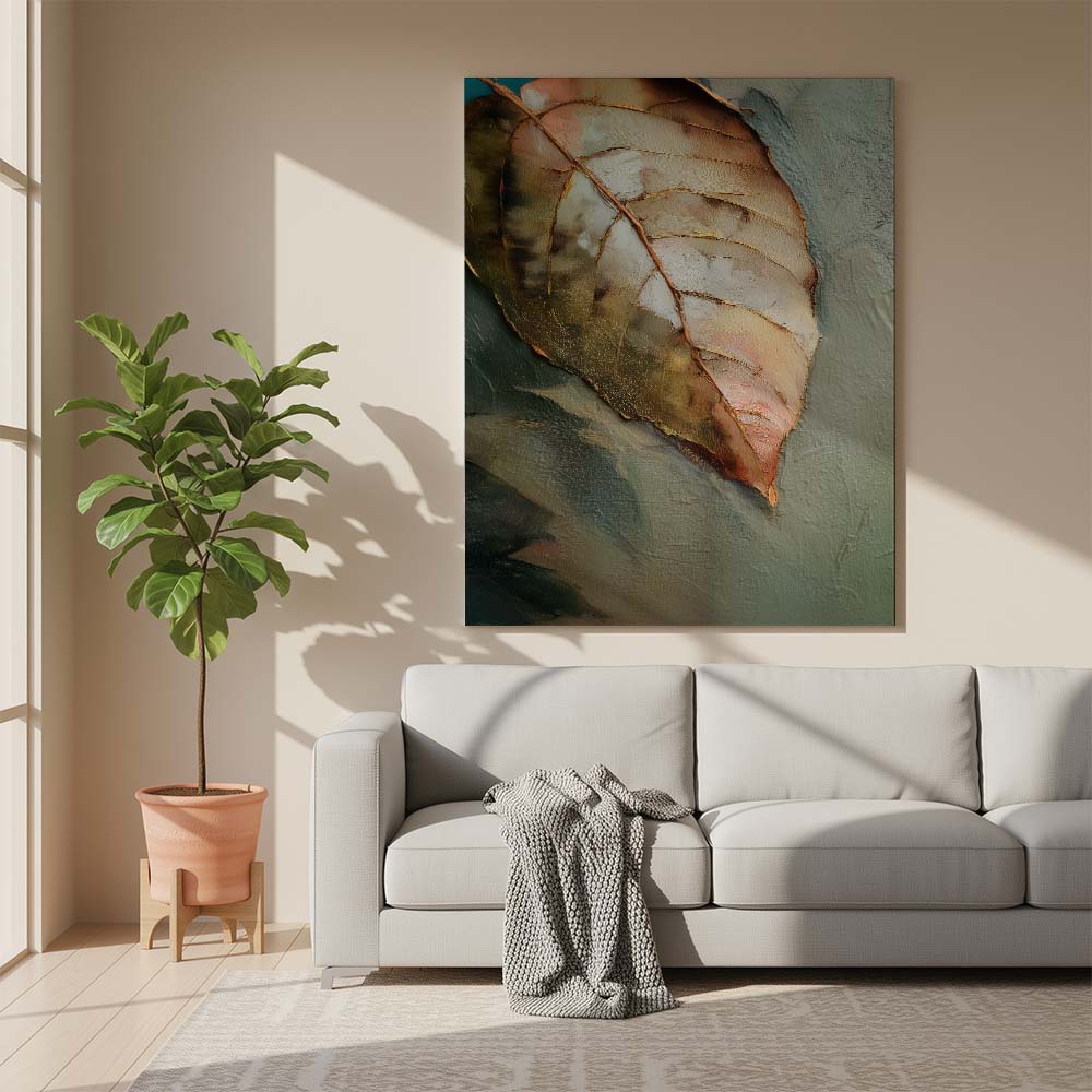 The palette is warm and understated, blending soft browns, muted greens, and gentle beige tones. Fine detailing and subtle textures bring out the veins and contours of the leaf, adding depth while maintaining a serene, minimal composition. The negative space enhances the feeling of silence and pause, allowing the subject to breathe effortlessly.