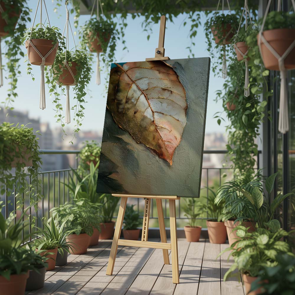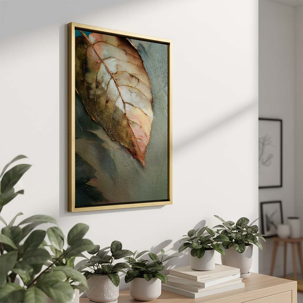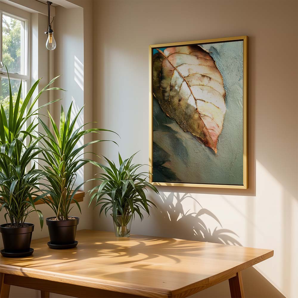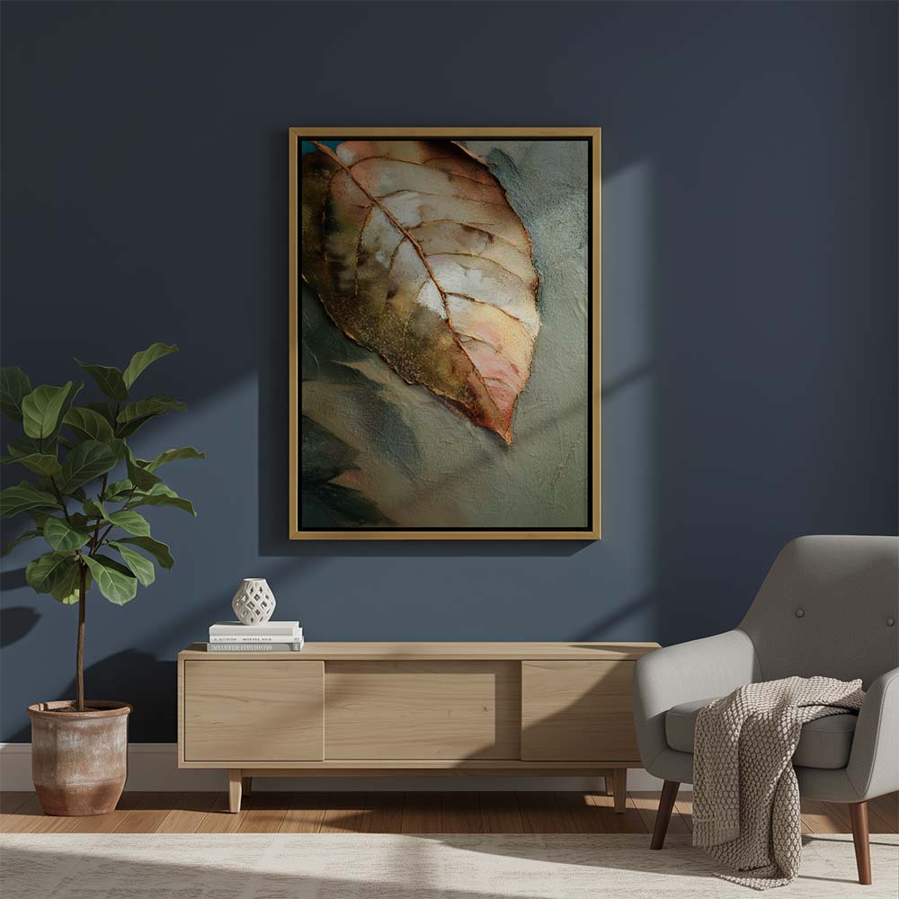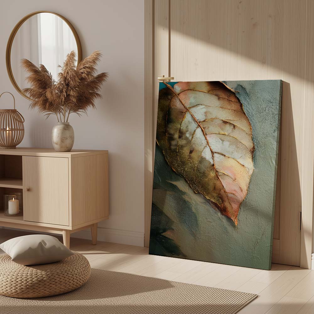 The palette is warm and understated, blending soft browns, muted greens, and gentle beige tones. Fine detailing and subtle textures bring out the veins and contours of the leaf, adding depth while maintaining a serene, minimal composition. The negative space enhances the feeling of silence and pause, allowing the subject to breathe effortlessly.