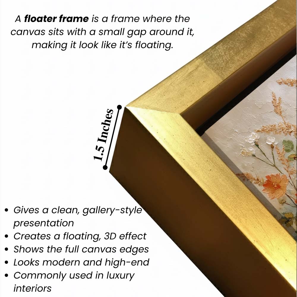 • Optional Floater Framing: Available with a premium floater frame option that creates a subtle gap between the canvas and the outer frame, enhancing depth and giving the artwork a refined, gallery-style floating effect that elevates its visual appeal.
