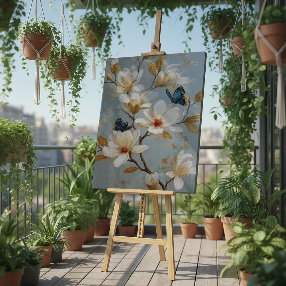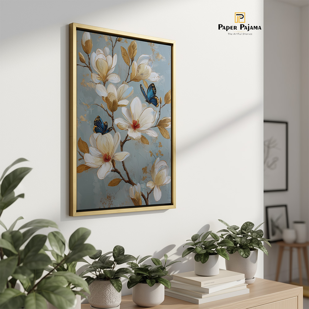 Fly Floral is a graceful celebration of quiet elegance and gentle movement. This beautifully composed printed artwork features delicate white blossoms unfolding against a soft, muted backdrop, with butterflies resting lightly among the branches. The scene feels calm, airy, and effortlessly poetic—like nature paused in a peaceful moment.