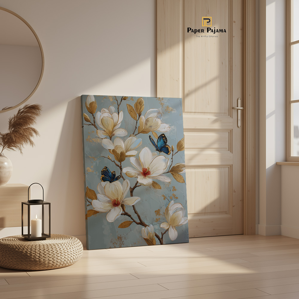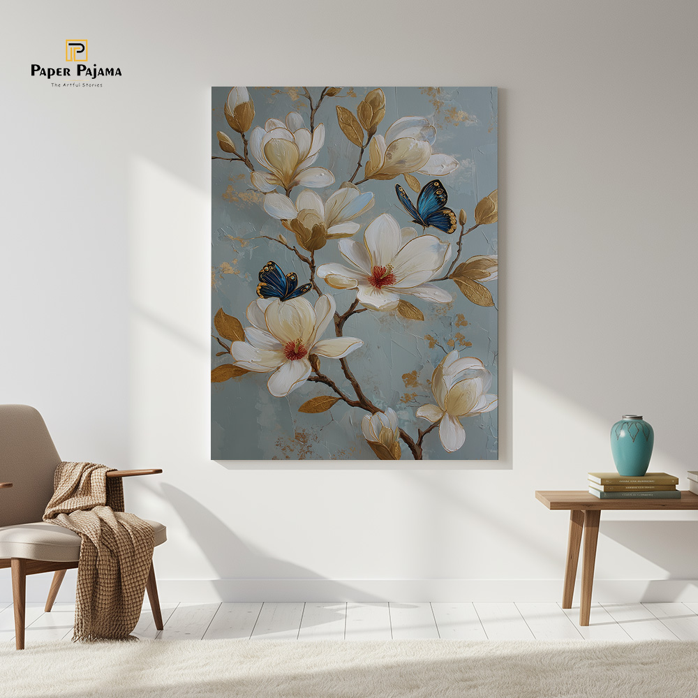 Subtle shades of ivory, warm gold, and soft blue create a soothing palette, while fine detailing adds depth without heaviness. The butterflies introduce a sense of life and flow, giving the artwork a serene rhythm that feels both refreshing and timeless.