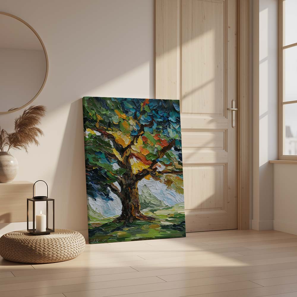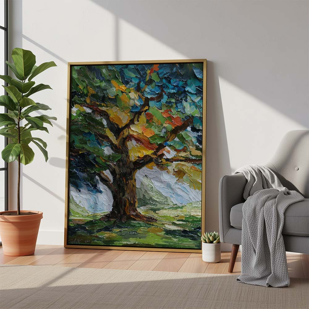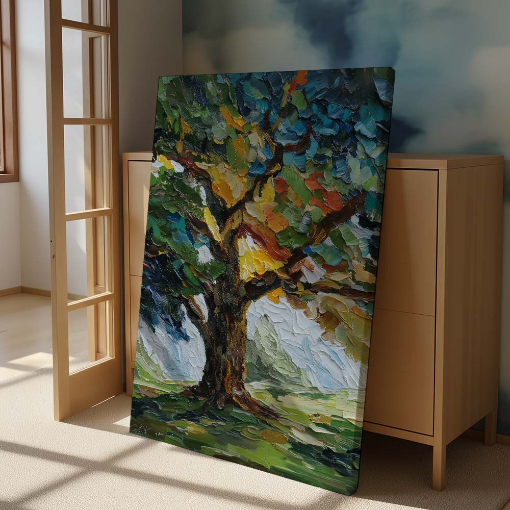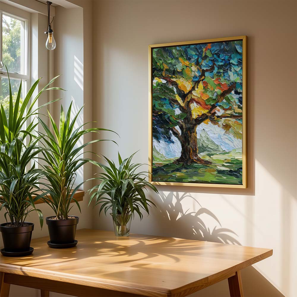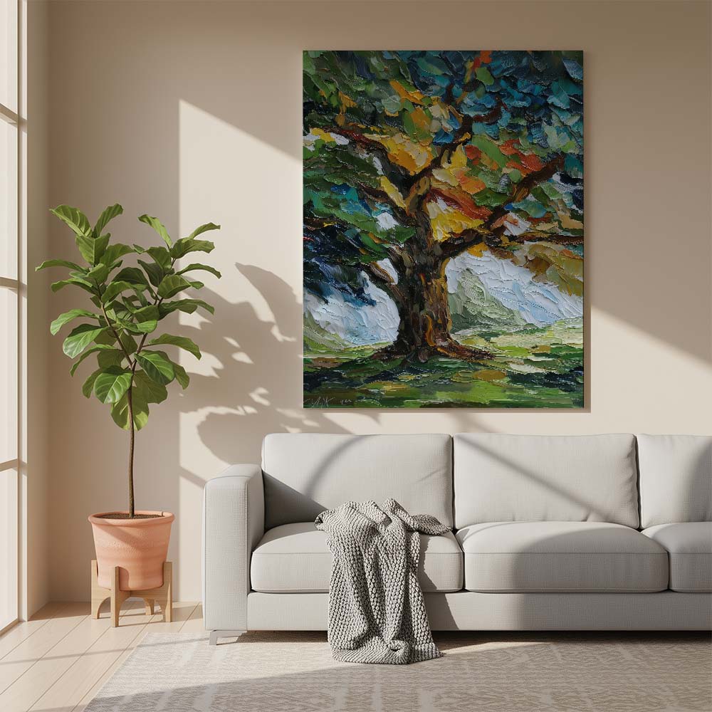 The thick, layered brushwork adds depth and intensity, while the composition draws the eye upward, emphasizing growth and strength. The contrast between light and shadow enhances the richness of the scene.