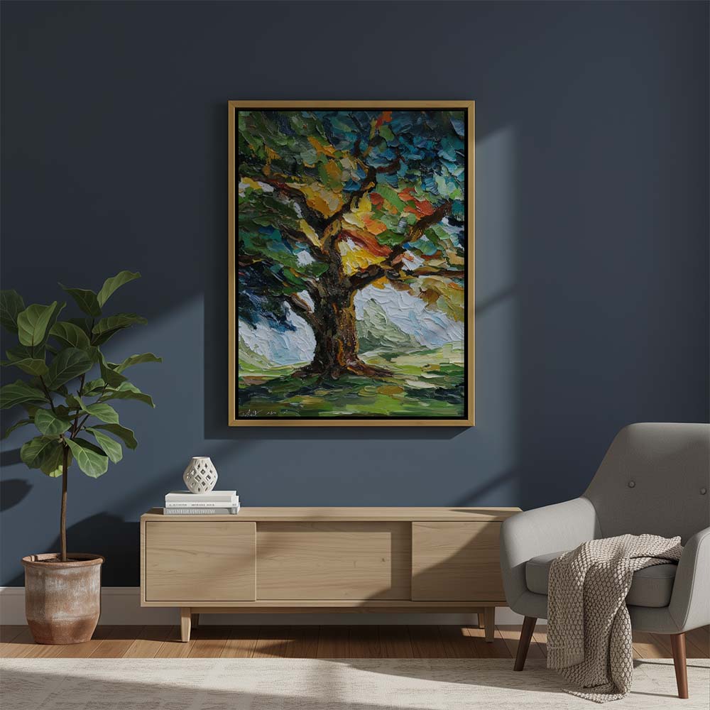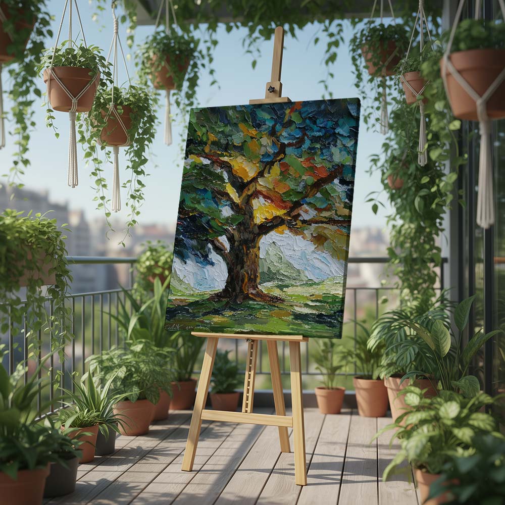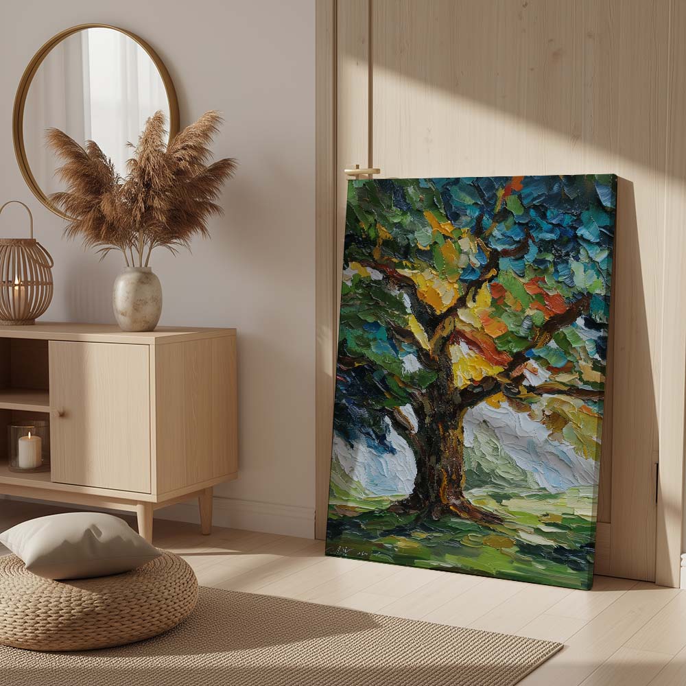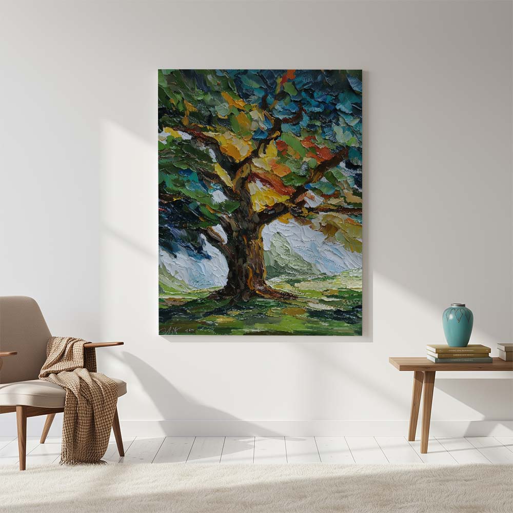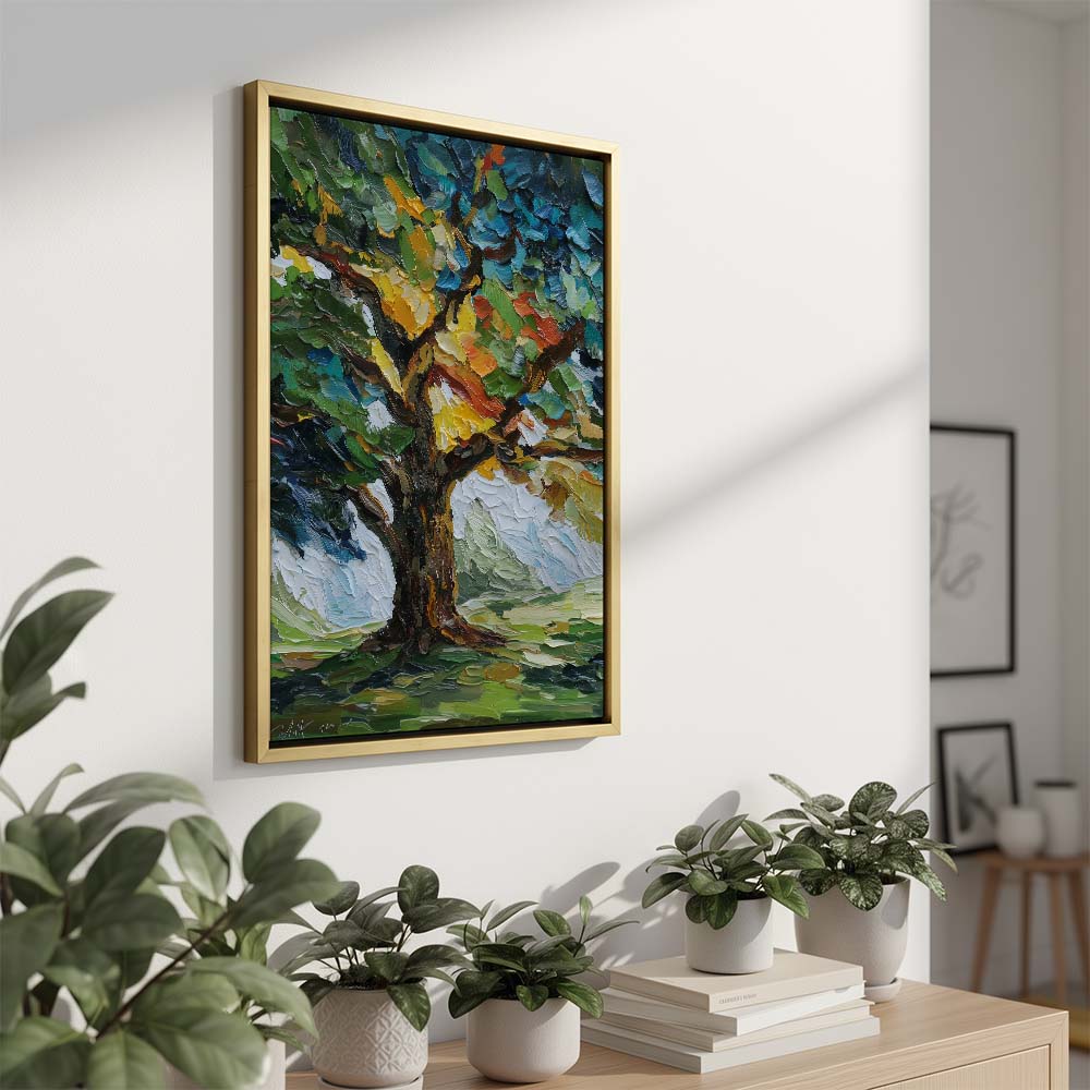 The thick, layered brushwork adds depth and intensity, while the composition draws the eye upward, emphasizing growth and strength. The contrast between light and shadow enhances the richness of the scene.