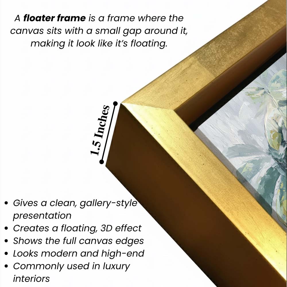 - Optional Floater Framing: Available with a premium floater frame option that creates a subtle gap between the canvas and the outer frame, enhancing depth and giving the artwork a refined, gallery-style floating effect that elevates its visual appeal.