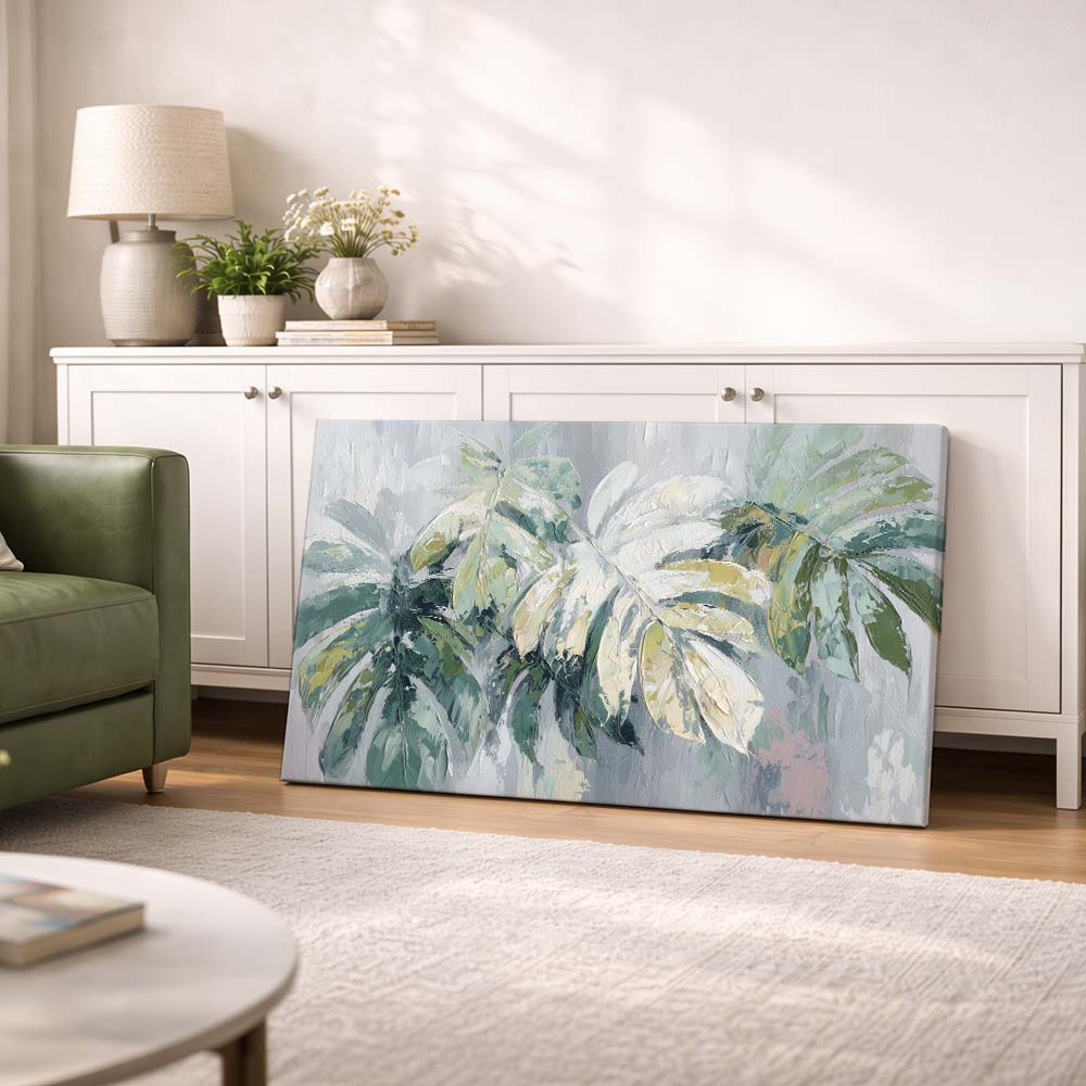 Fresh Palms is a light and breezy composition that captures the relaxed elegance of tropical foliage. The artwork features soft green palm leaves set against a gentle, neutral background, creating a refreshing and airy visual.