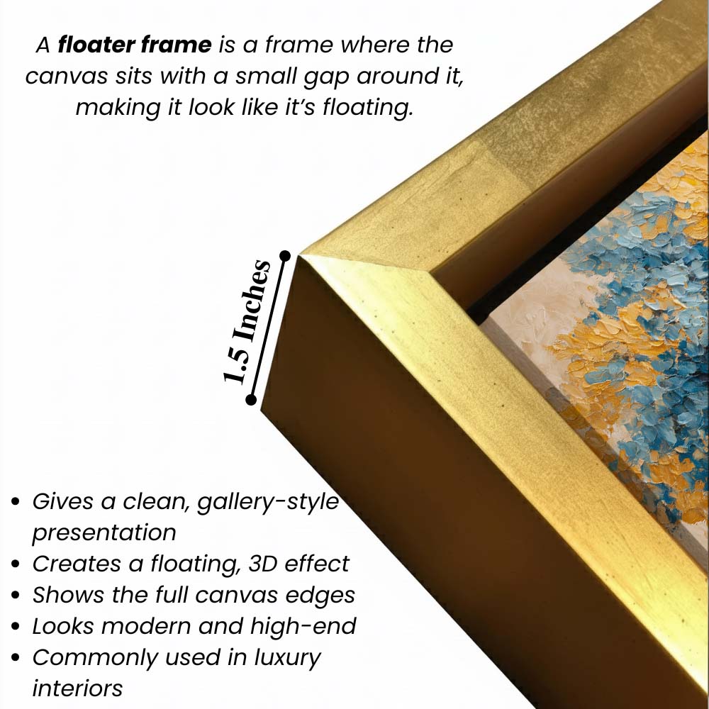 - Optional Floater Framing: Available with a premium floater frame option that creates a subtle gap between the canvas and the outer frame, enhancing depth and giving the artwork a refined, gallery-style floating effect that elevates its visual appeal.
