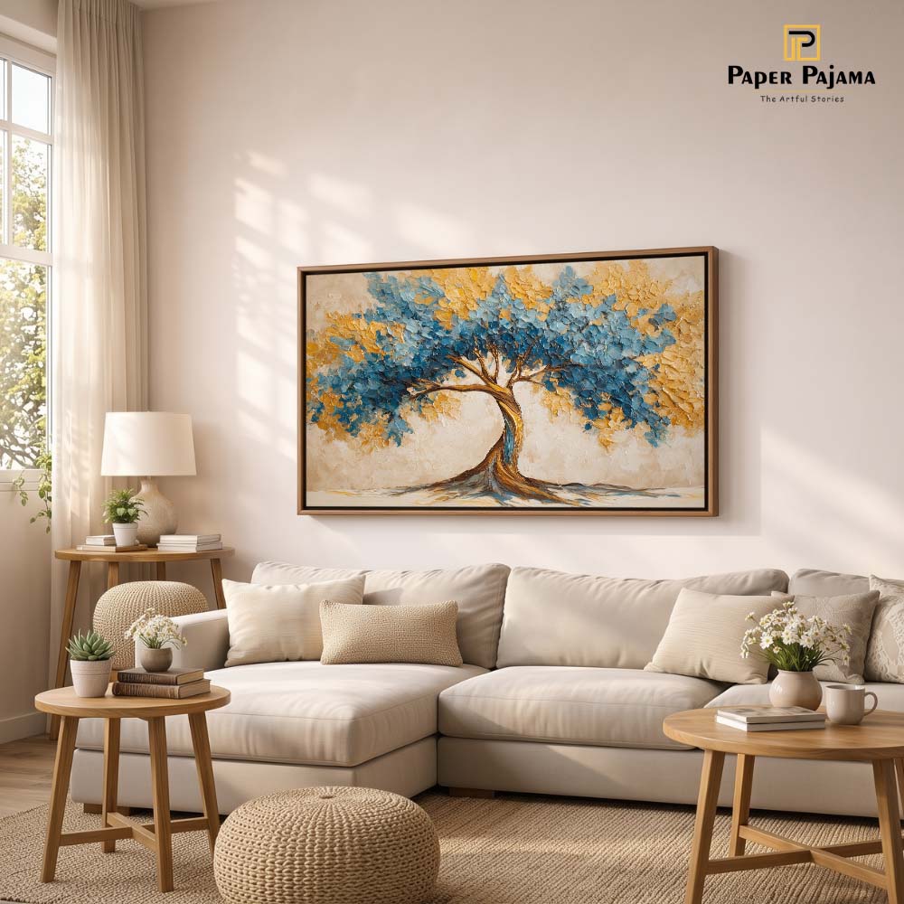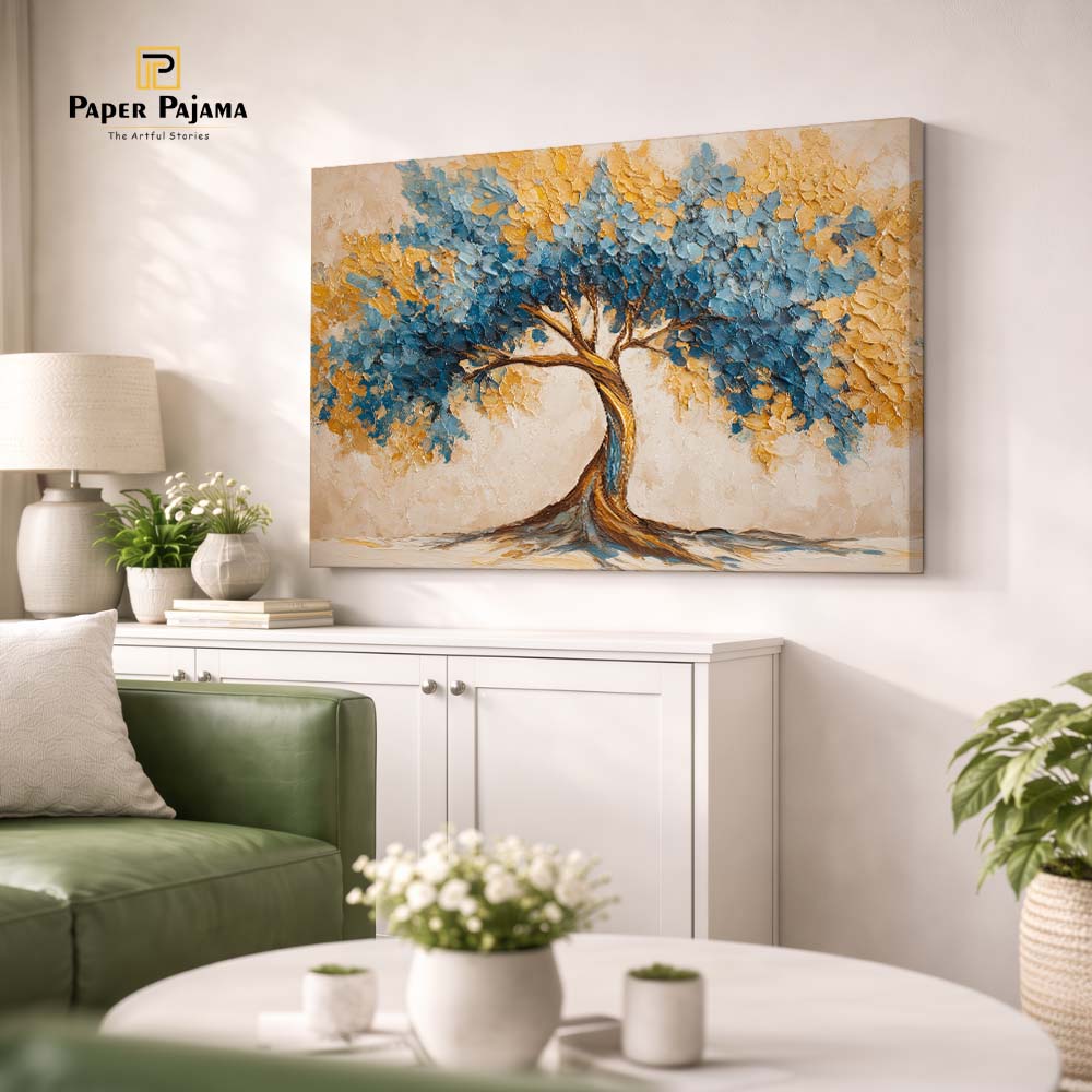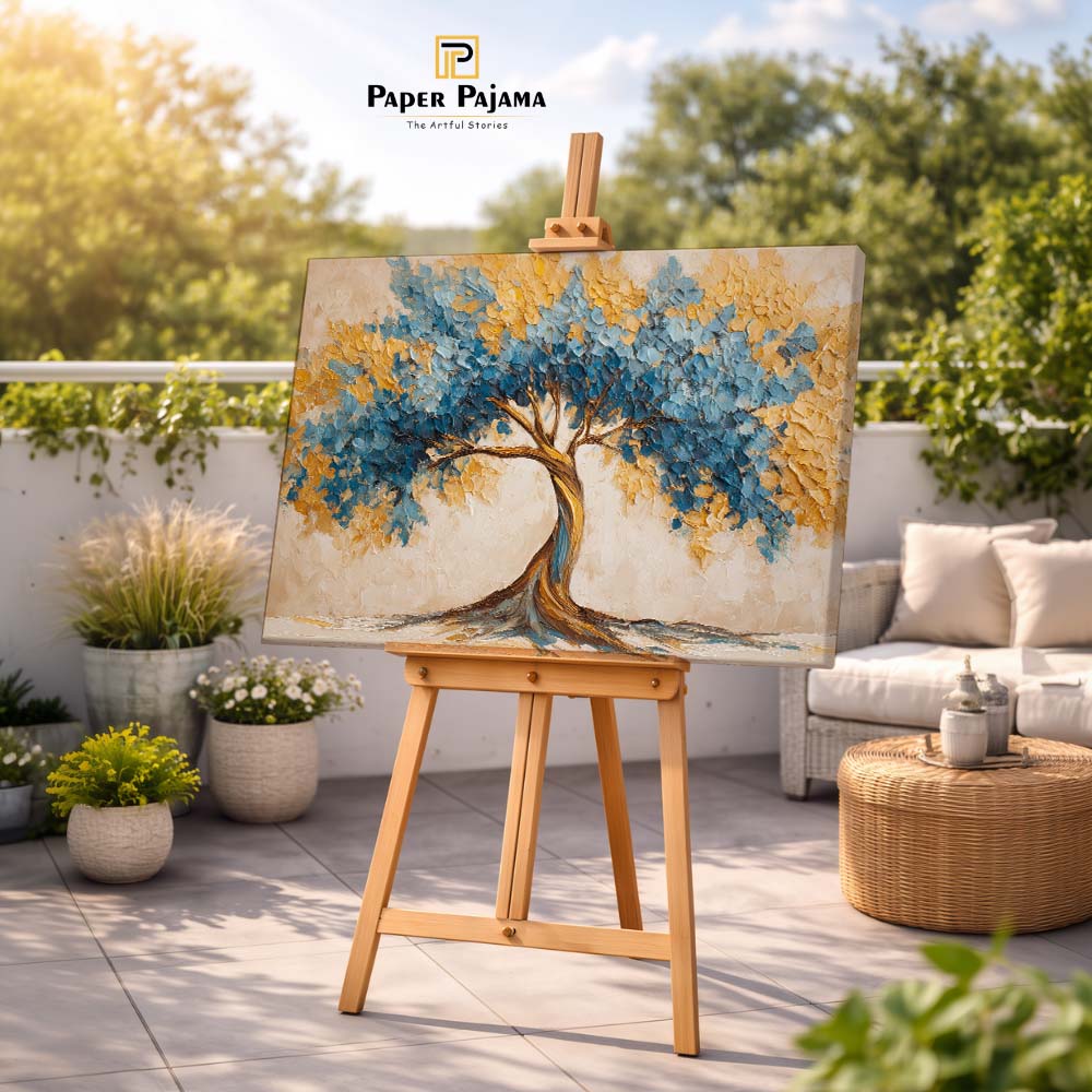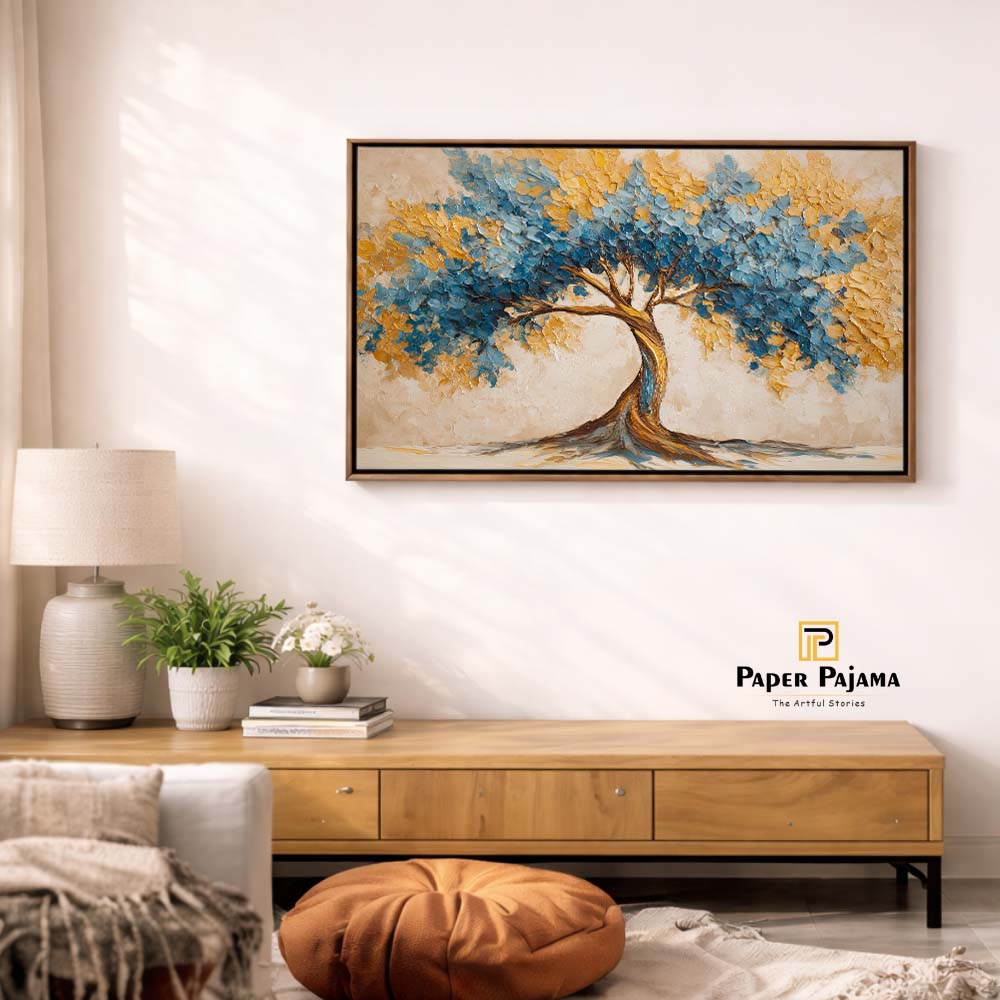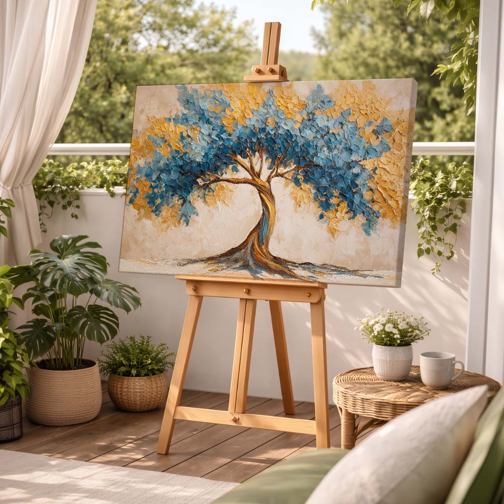 Impasto Nature 40 is a bold and textured celebration of nature, brought to life through thick, expressive brush strokes and rich, layered color. The artwork features a striking tree form with a sweeping canopy, painted in vibrant blues and warm golden hues.