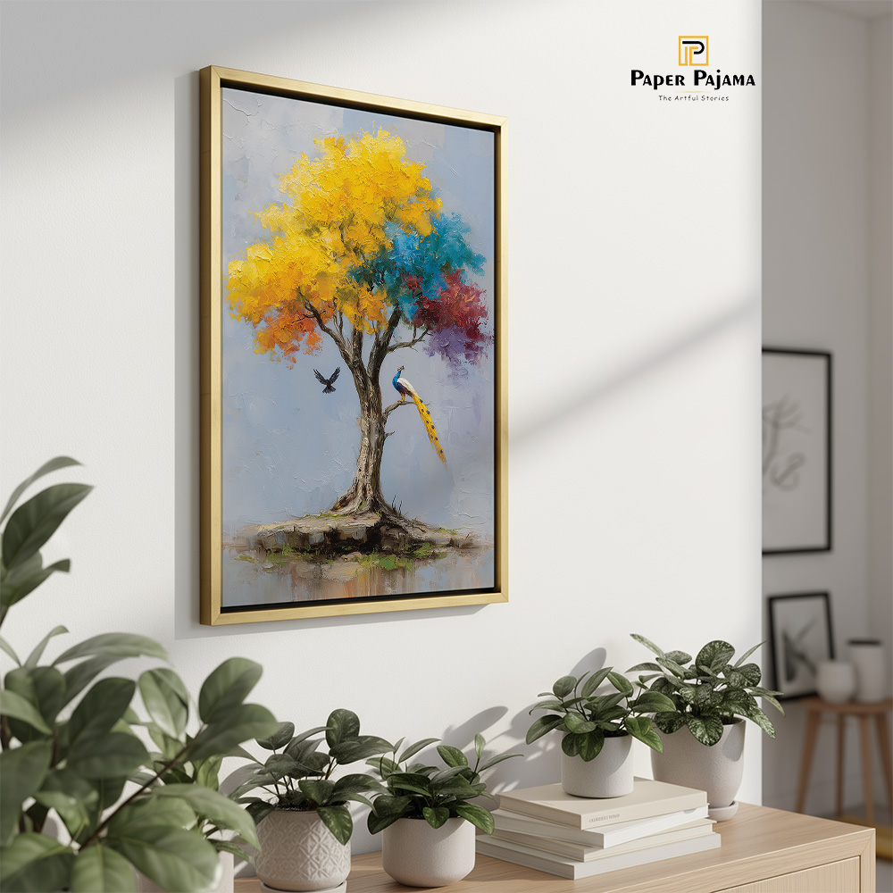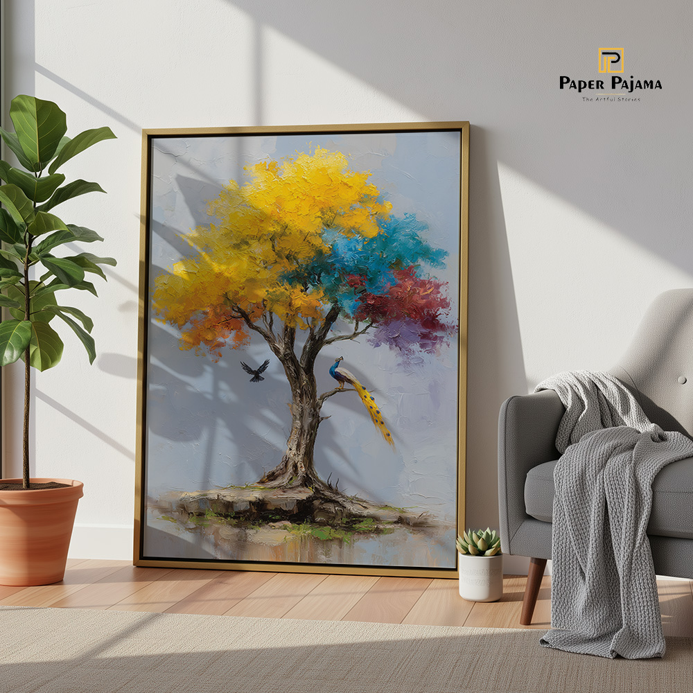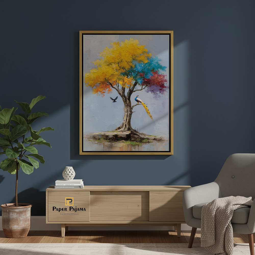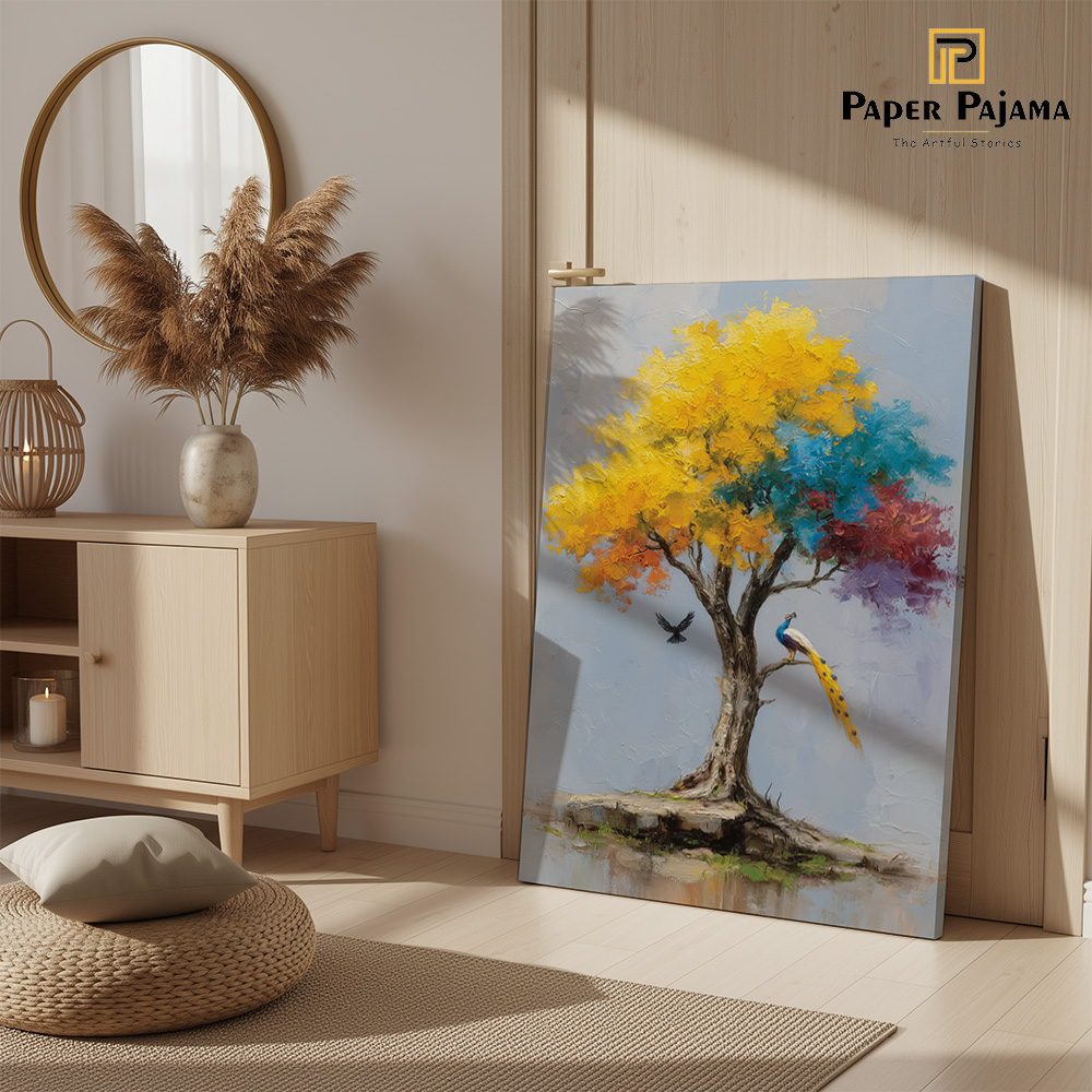 Kalpvriksha is a visual ode to abundance, hope, and quiet miracles. This enchanting printed artwork portrays a radiant tree in full bloom, its canopy alive with golden yellows, calming blues, and soft hints of warmth—symbolizing growth, harmony, and fulfilled wishes. A poised peacock and a gentle bird in flight add a sense of life and balance to the scene.