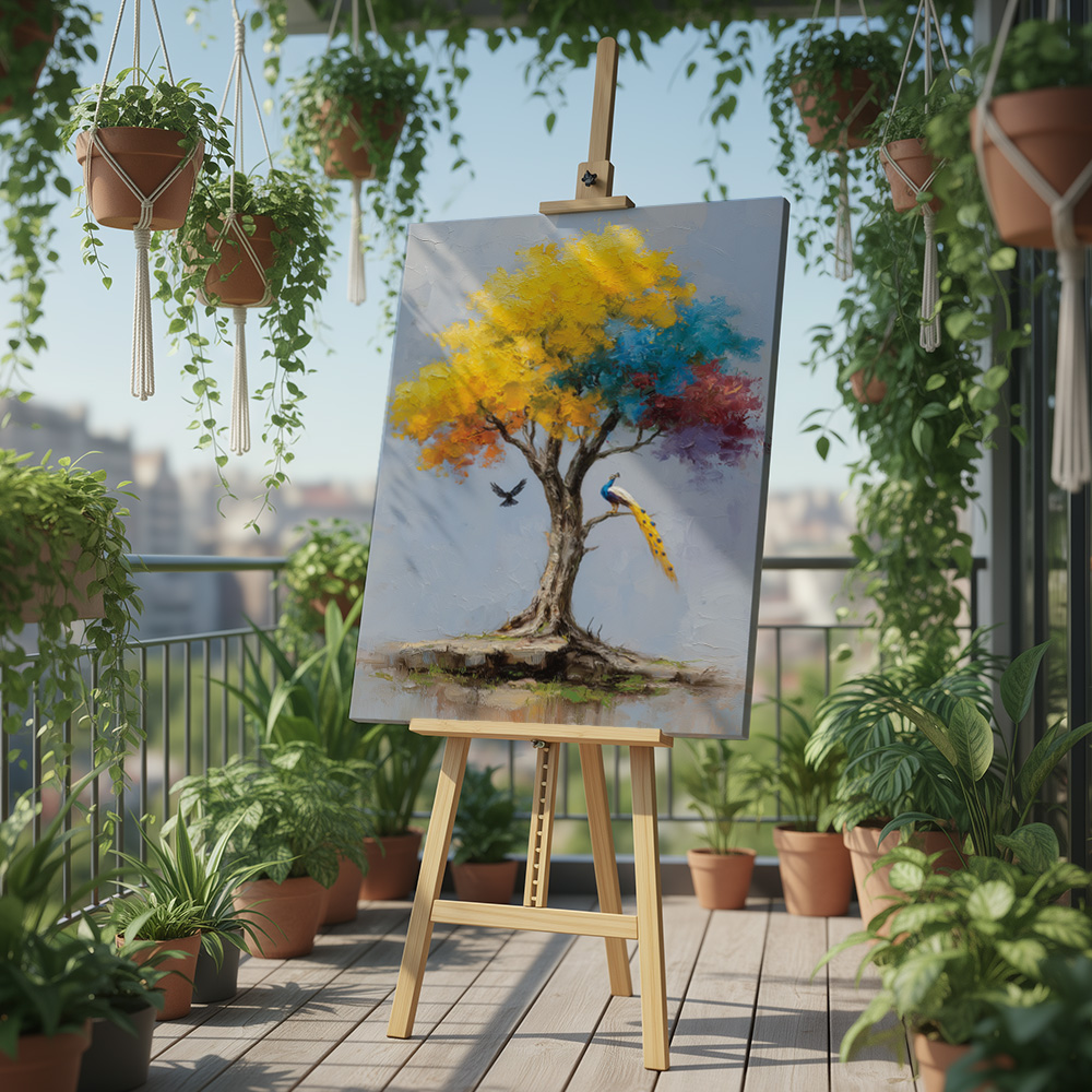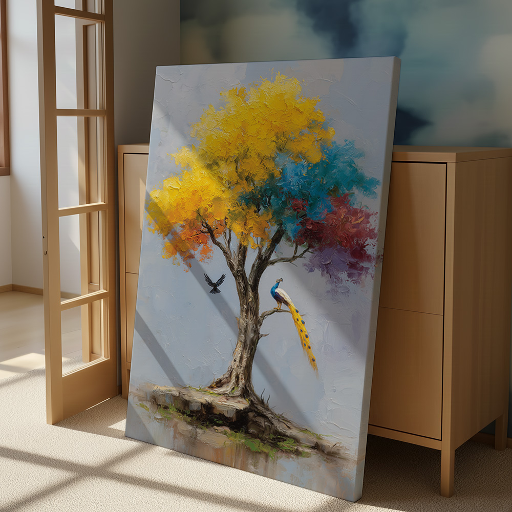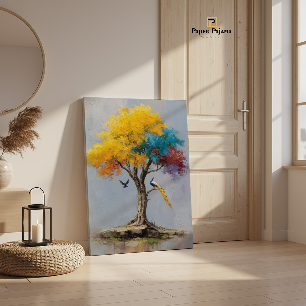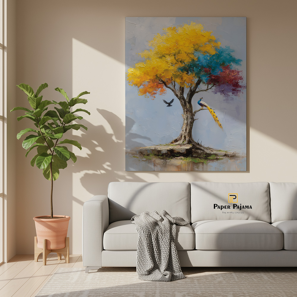 Kalpvriksha is a visual ode to abundance, hope, and quiet miracles. This enchanting printed artwork portrays a radiant tree in full bloom, its canopy alive with golden yellows, calming blues, and soft hints of warmth—symbolizing growth, harmony, and fulfilled wishes. A poised peacock and a gentle bird in flight add a sense of life and balance to the scene.