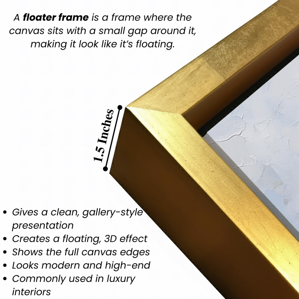 • Optional Floater Framing: Available with a premium floater frame option that creates a subtle gap between the canvas and the outer frame, enhancing depth and giving the artwork a refined, gallery-style floating effect that elevates its visual appeal.