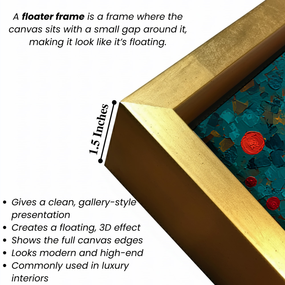 - Optional Floater Framing: Available with a premium floater frame option that creates a subtle gap between the canvas and the outer frame, enhancing depth and giving the artwork a refined, gallery-style floating effect that elevates its visual appeal.