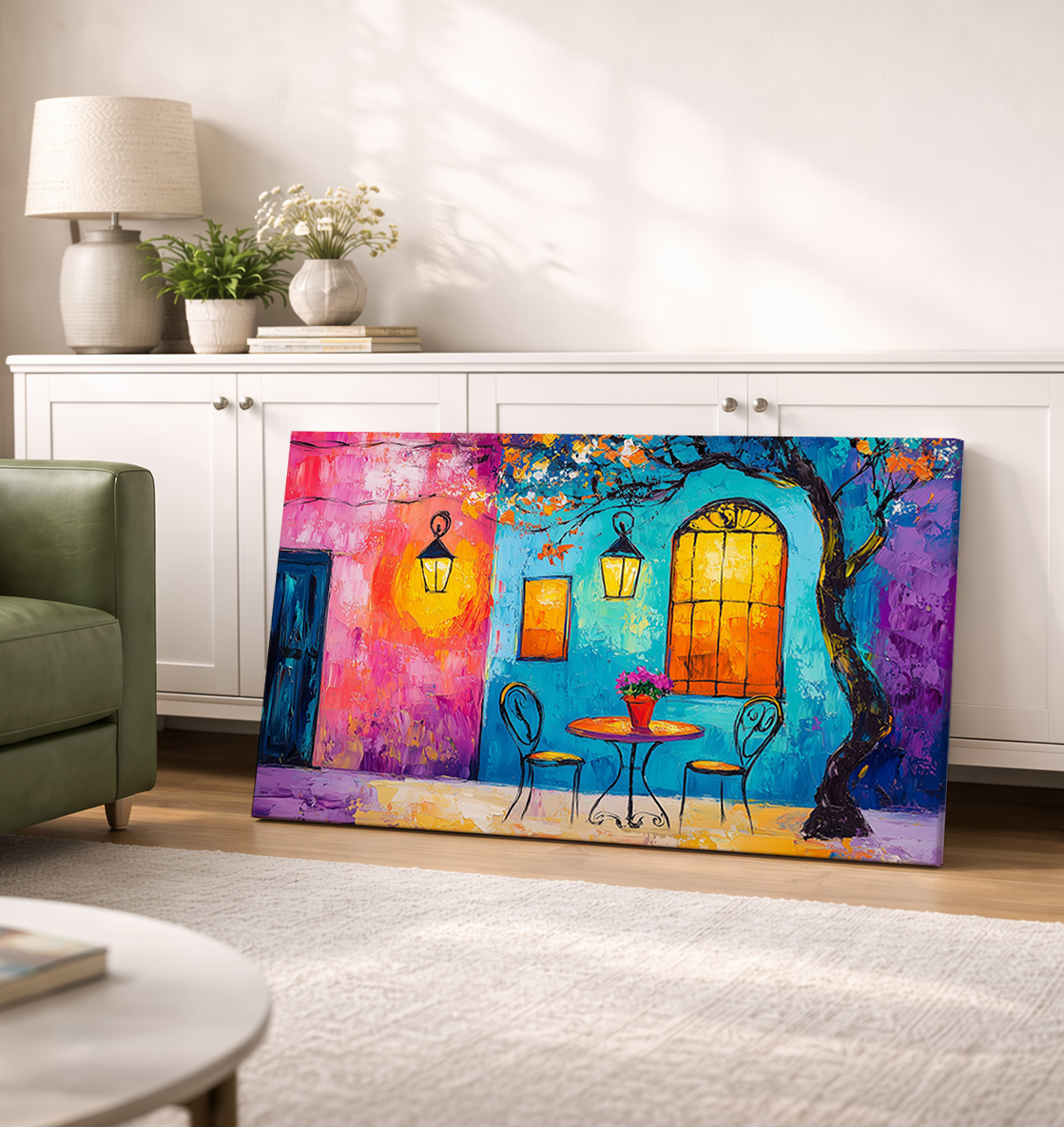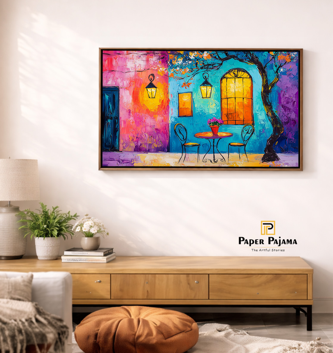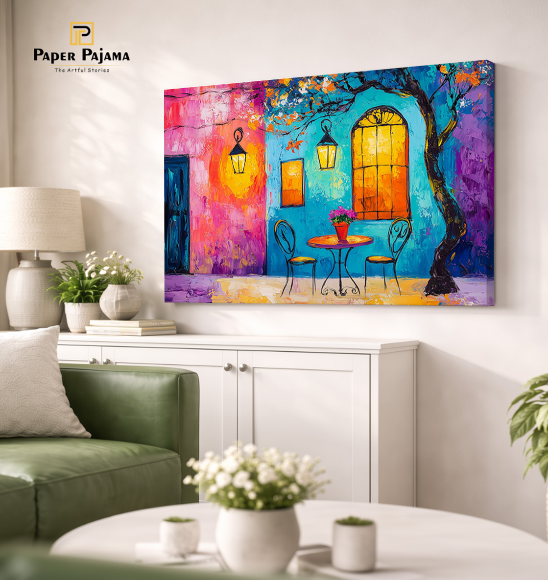 Lazy Corner is a vibrant invitation to slow down and savor simple moments. This charming printed artwork captures a cozy outdoor café nook, where warm glowing lanterns, a quaint round table, and delicate wrought-iron chairs rest against a backdrop of lively turquoise, pink, and violet walls. The scene feels intimate, cheerful, and effortlessly welcoming.