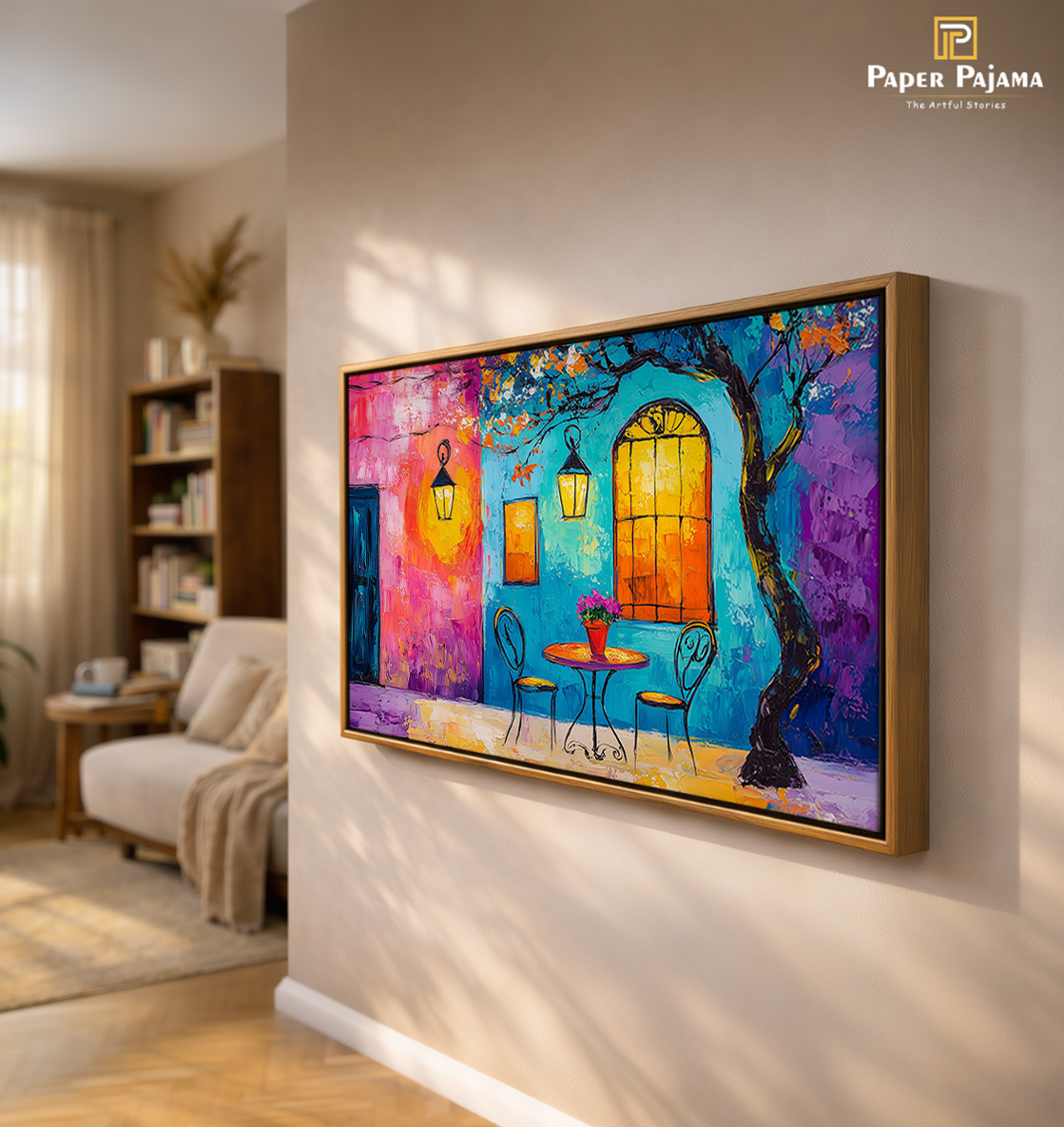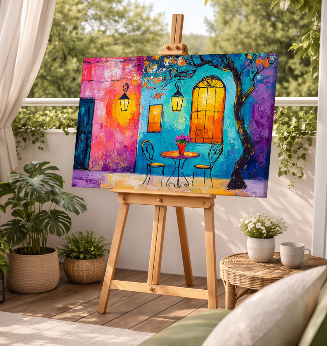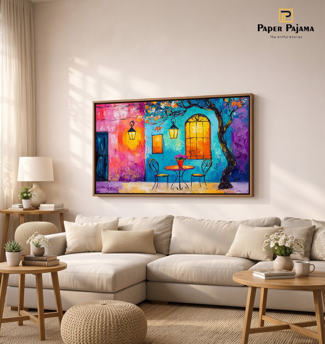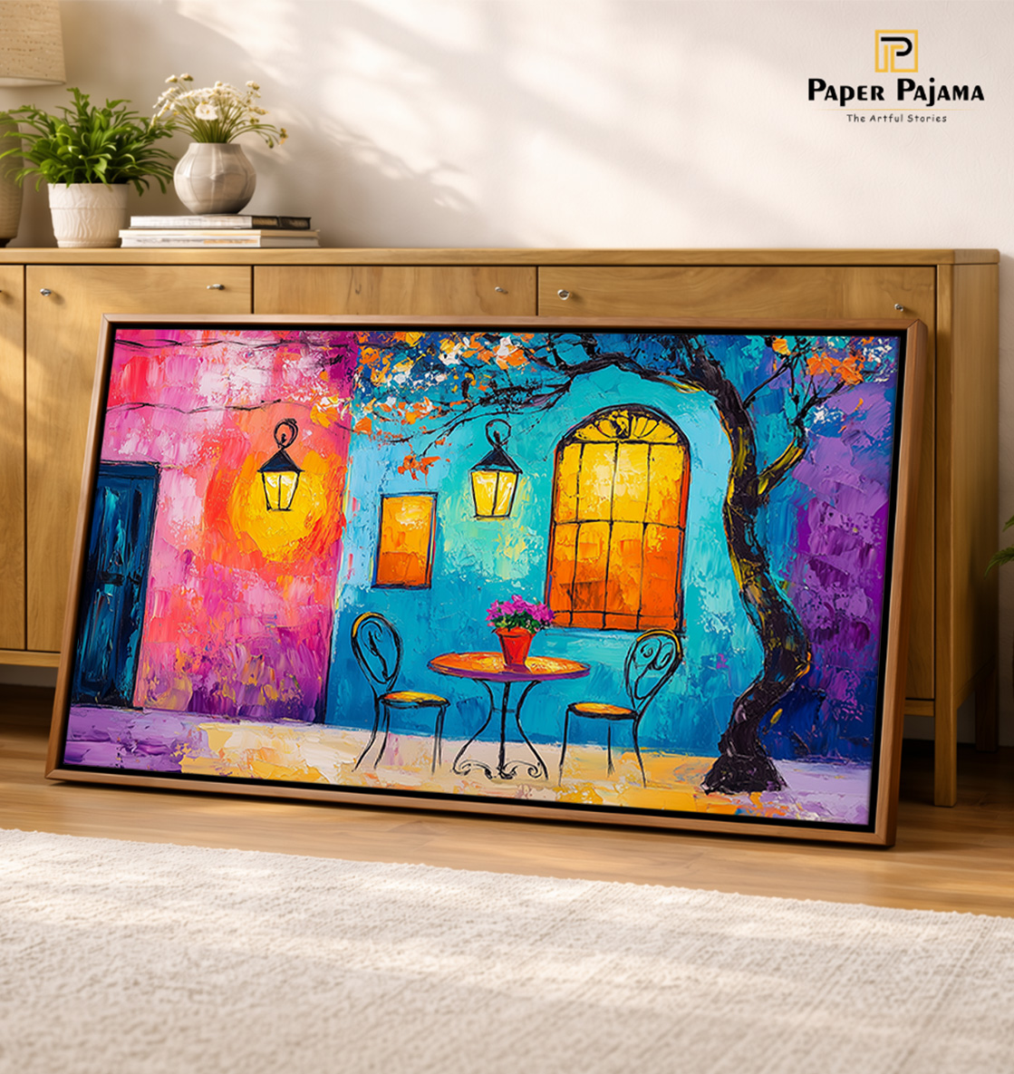 Lazy Corner is a vibrant invitation to slow down and savor simple moments. This charming printed artwork captures a cozy outdoor café nook, where warm glowing lanterns, a quaint round table, and delicate wrought-iron chairs rest against a backdrop of lively turquoise, pink, and violet walls. The scene feels intimate, cheerful, and effortlessly welcoming.