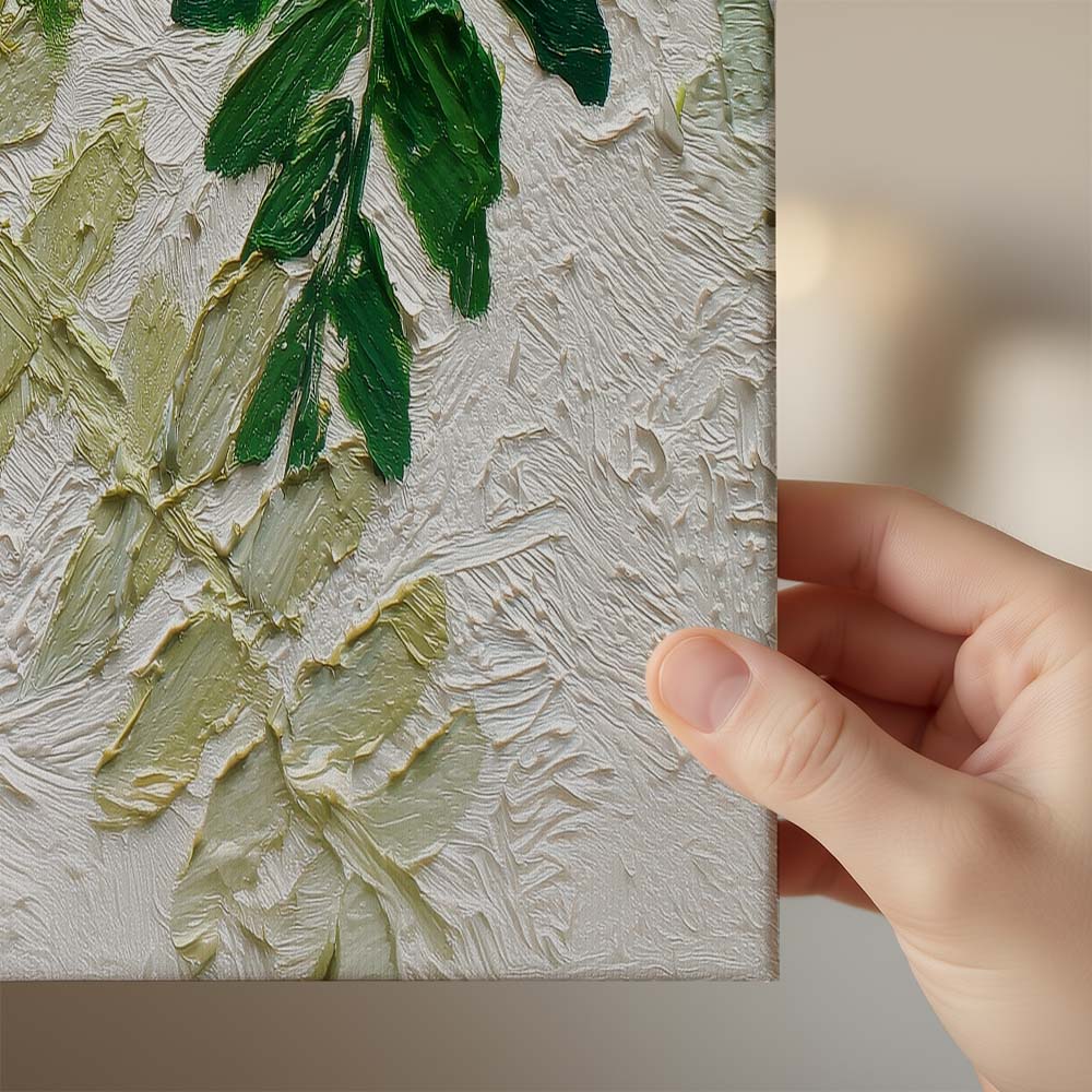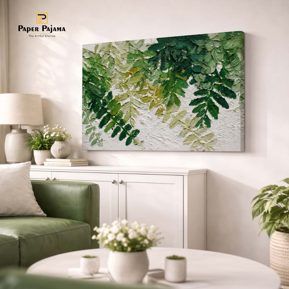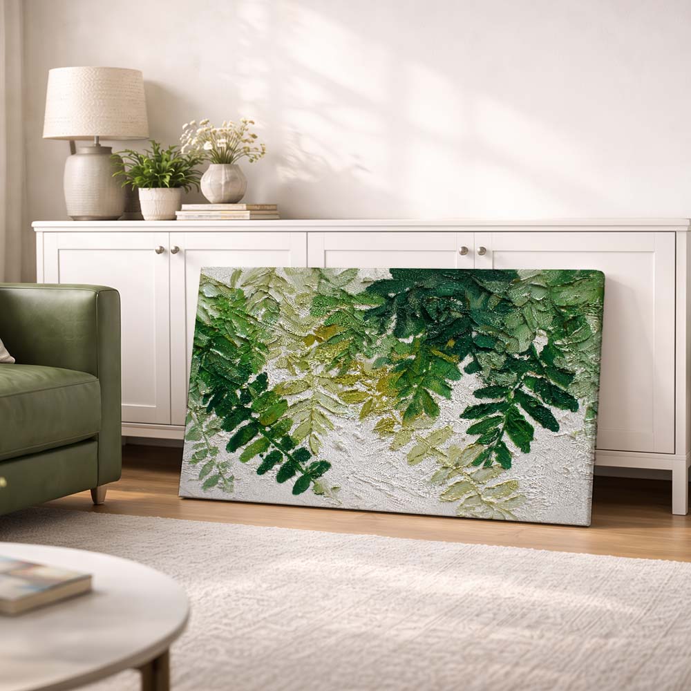The varied shades of green and delicate detailing bring a natural realism, while the overlapping layers add visual richness. The composition feels calm yet full, offering a sense of being surrounded by nature.