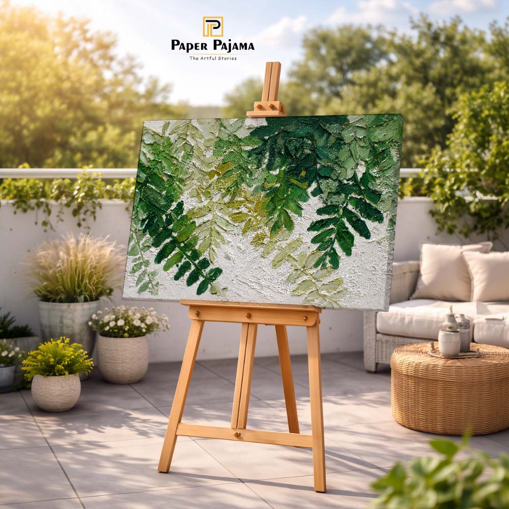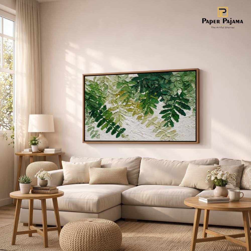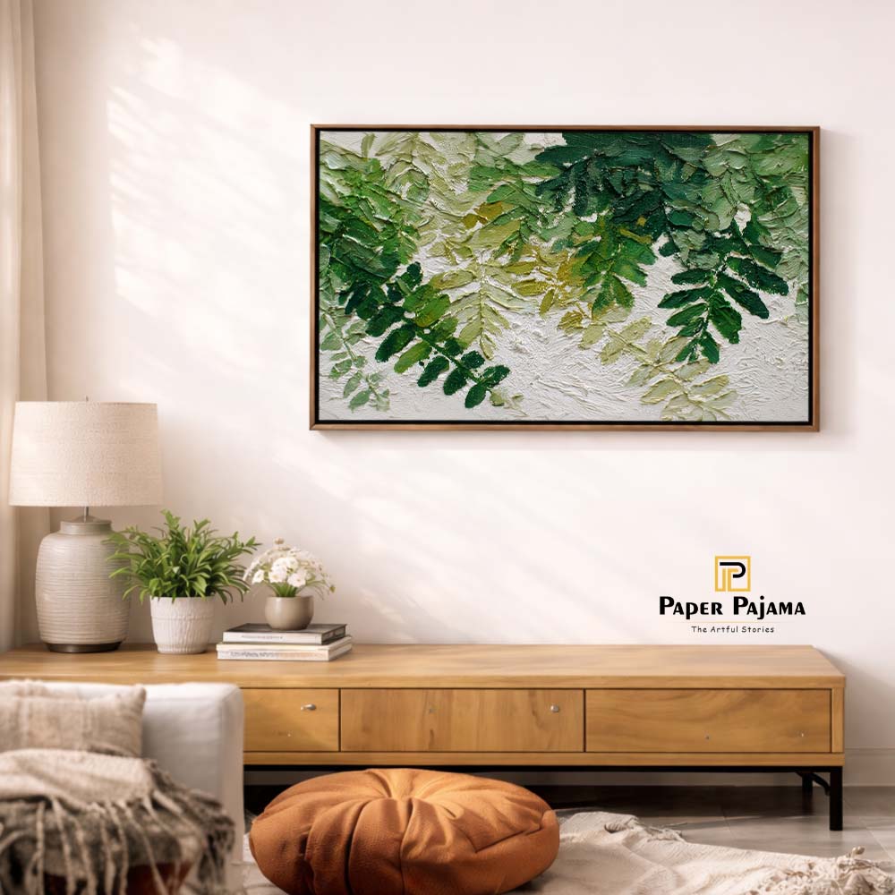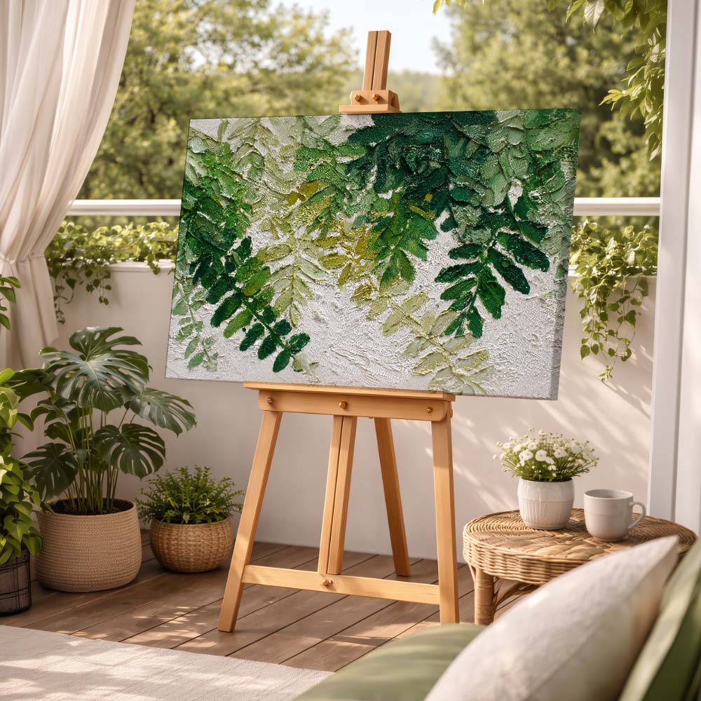 The varied shades of green and delicate detailing bring a natural realism, while the overlapping layers add visual richness. The composition feels calm yet full, offering a sense of being surrounded by nature.