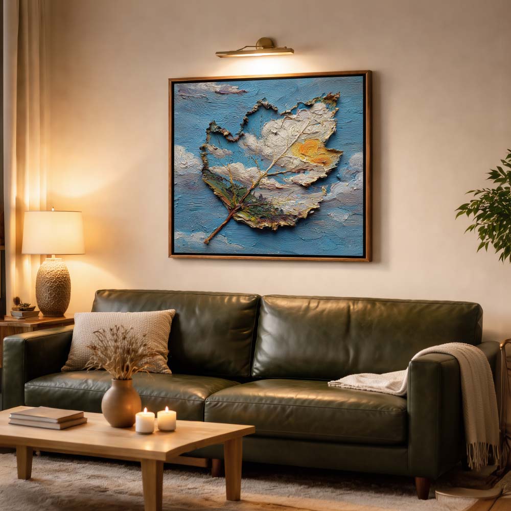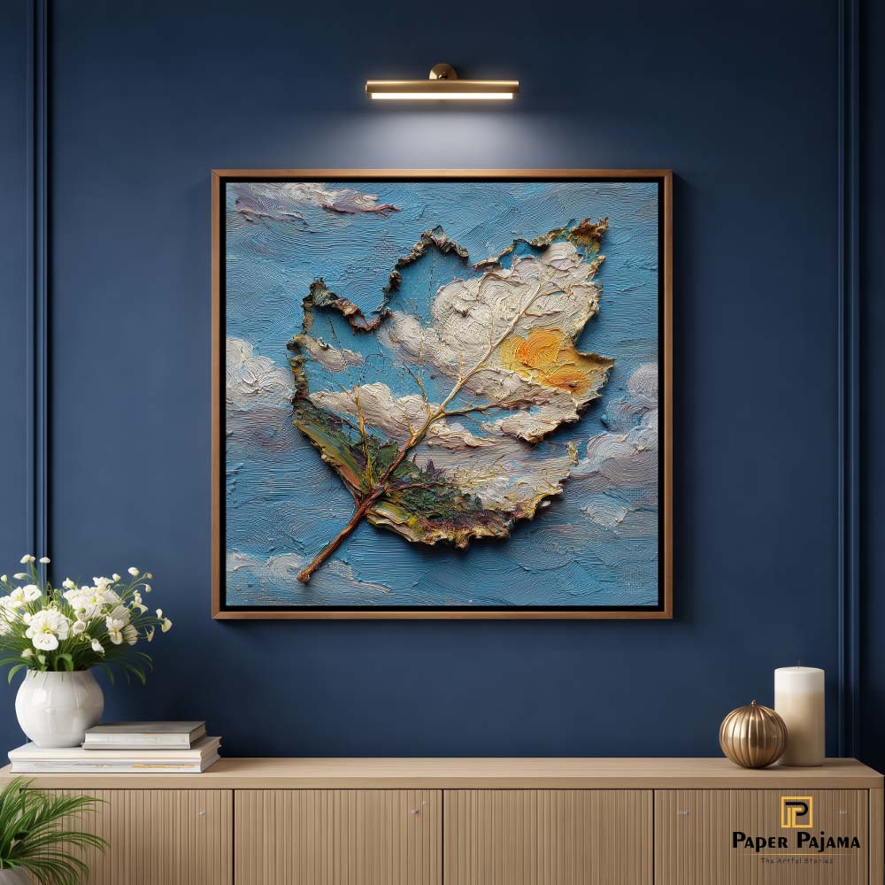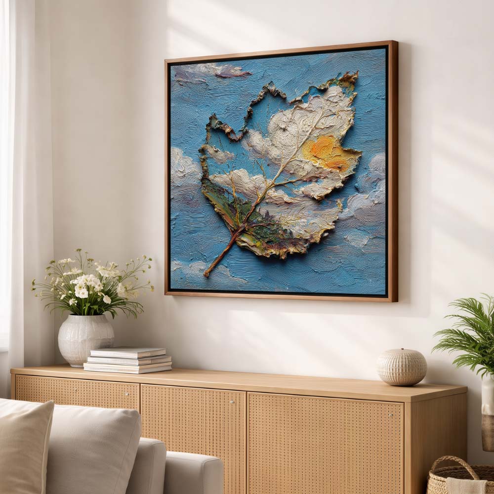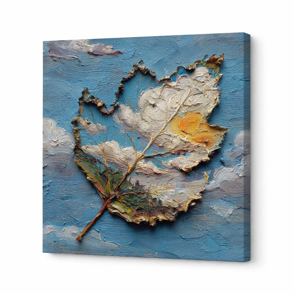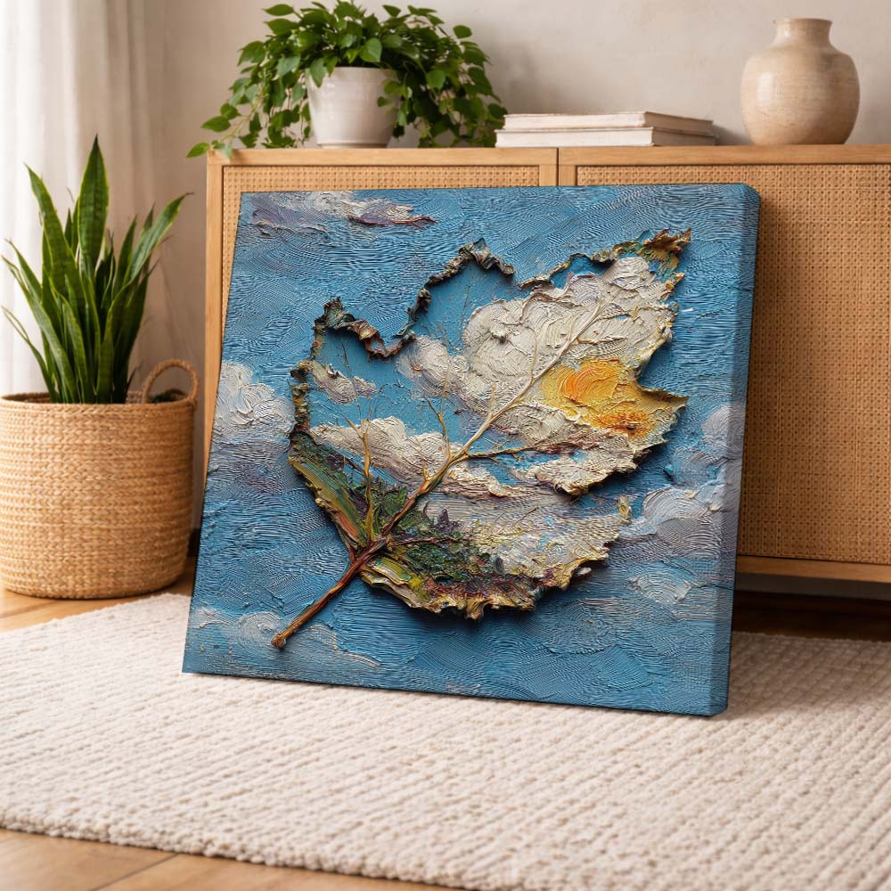 The textured surface and irregular edges of the leaf create a sculptural effect, while the contrast between earthy tones and the vibrant sky enhances its depth. The piece feels both grounded and expressive.