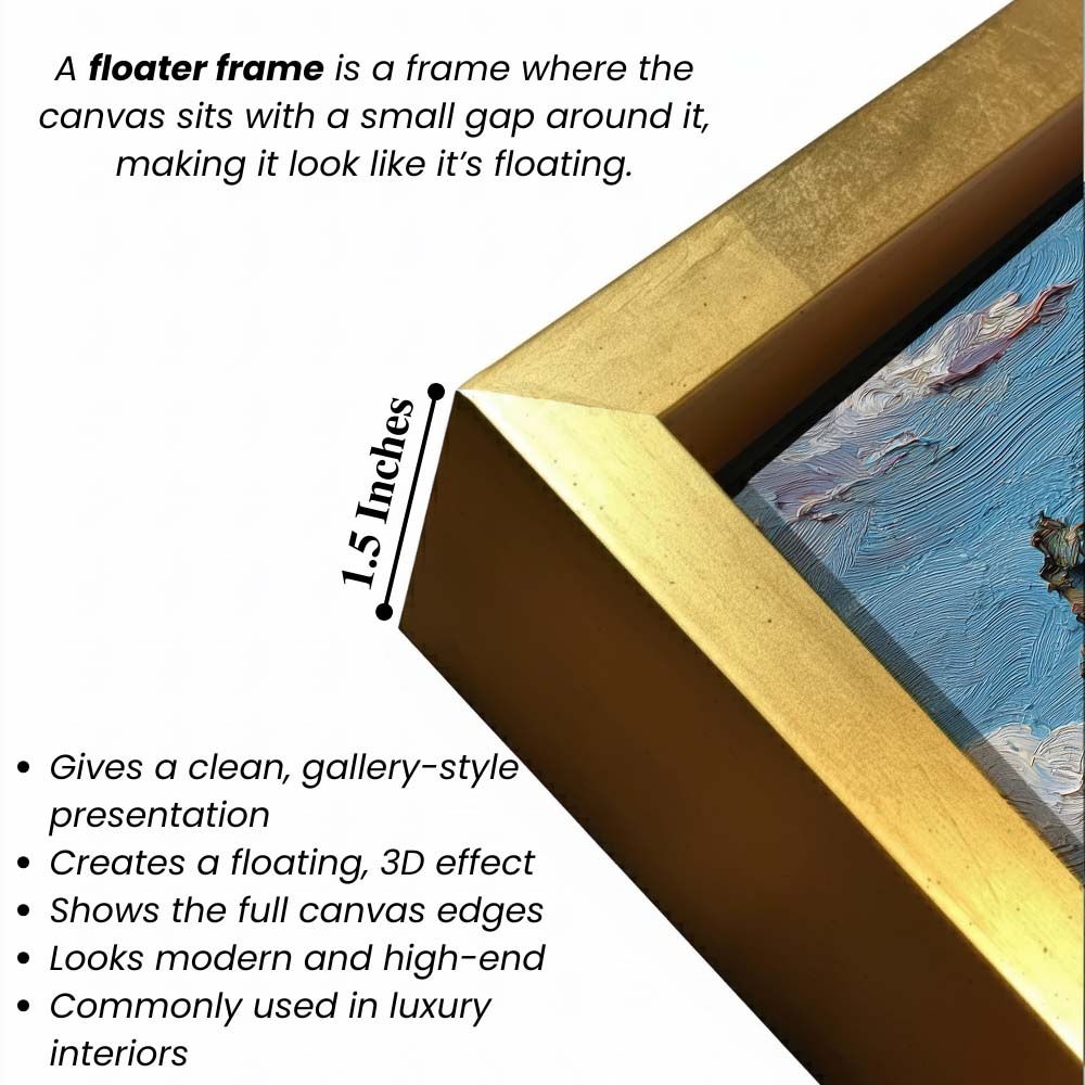 - Optional Floater Framing: Available with a premium floater frame option that creates a subtle gap between the canvas and the outer frame, enhancing depth and giving the artwork a refined, gallery-style floating effect that elevates its visual appeal.