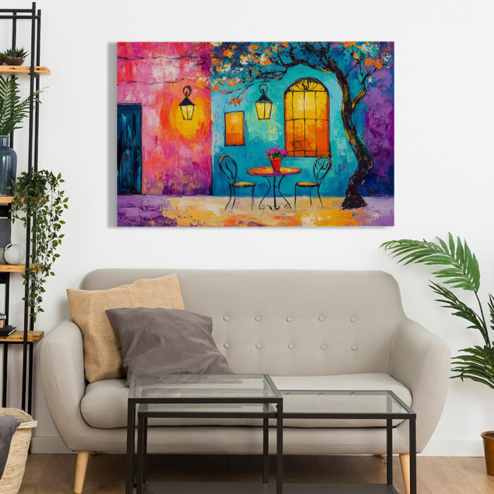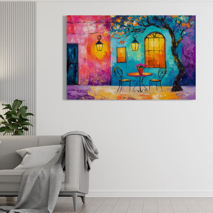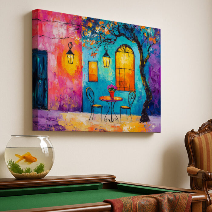 A colorful cafe corner glows under lantern light, inviting peaceful conversations and late-night coffee.