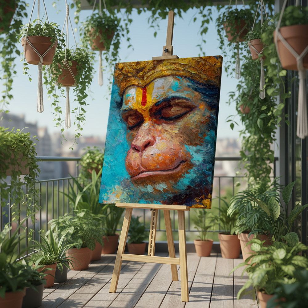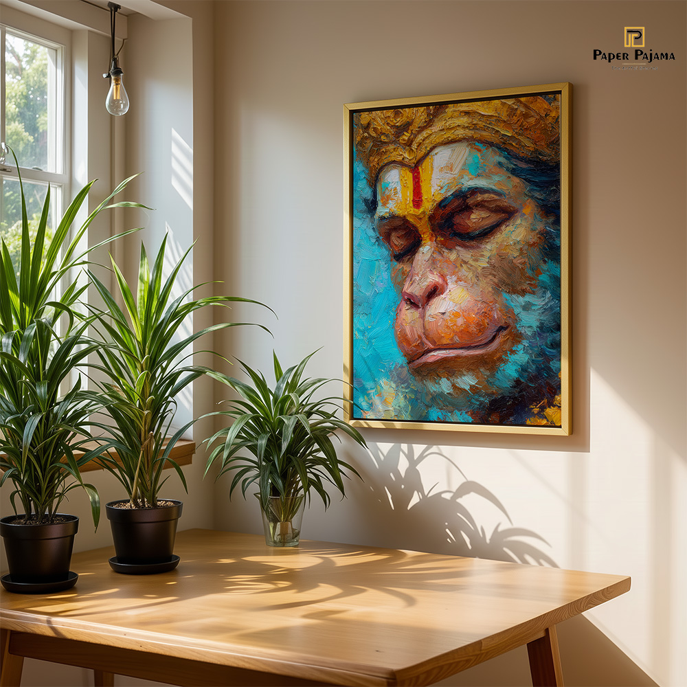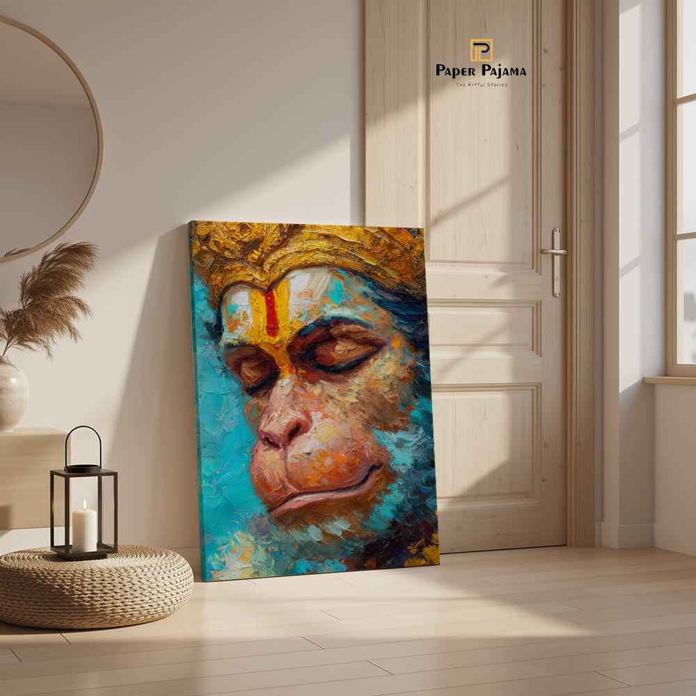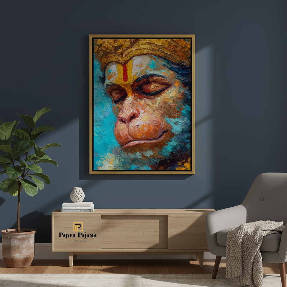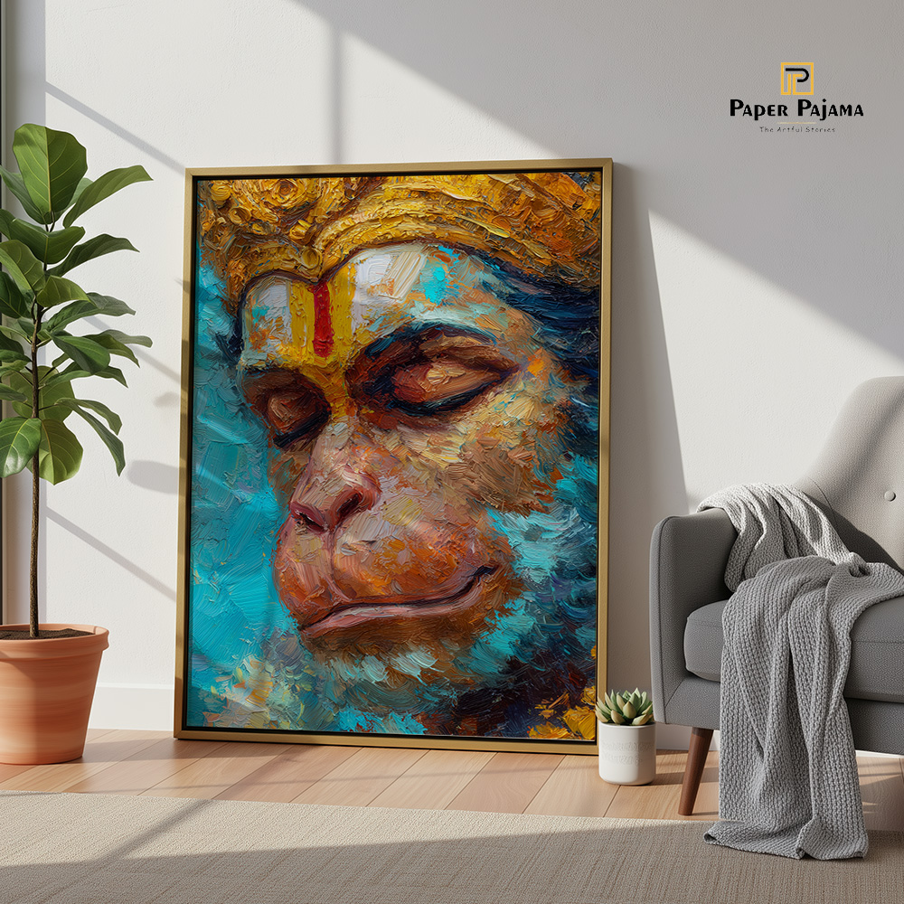 Prem Samarpan is a deeply moving reflection of devotion, surrender, and quiet strength. This expressive printed artwork captures Hanuman in a moment of serene introspection, eyes gently closed, as if immersed in unwavering love and faith. The close composition draws attention to emotion rather than action, allowing stillness to speak louder than movement.