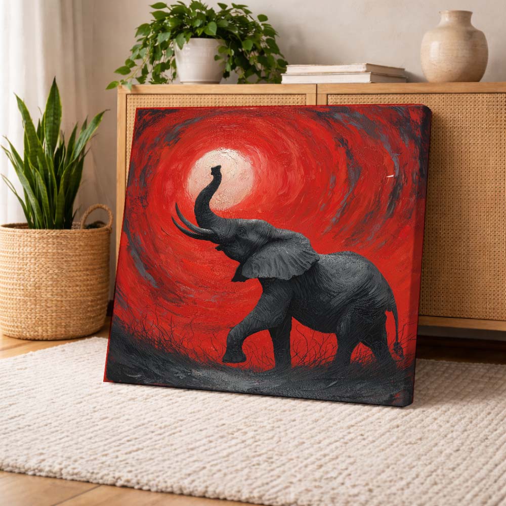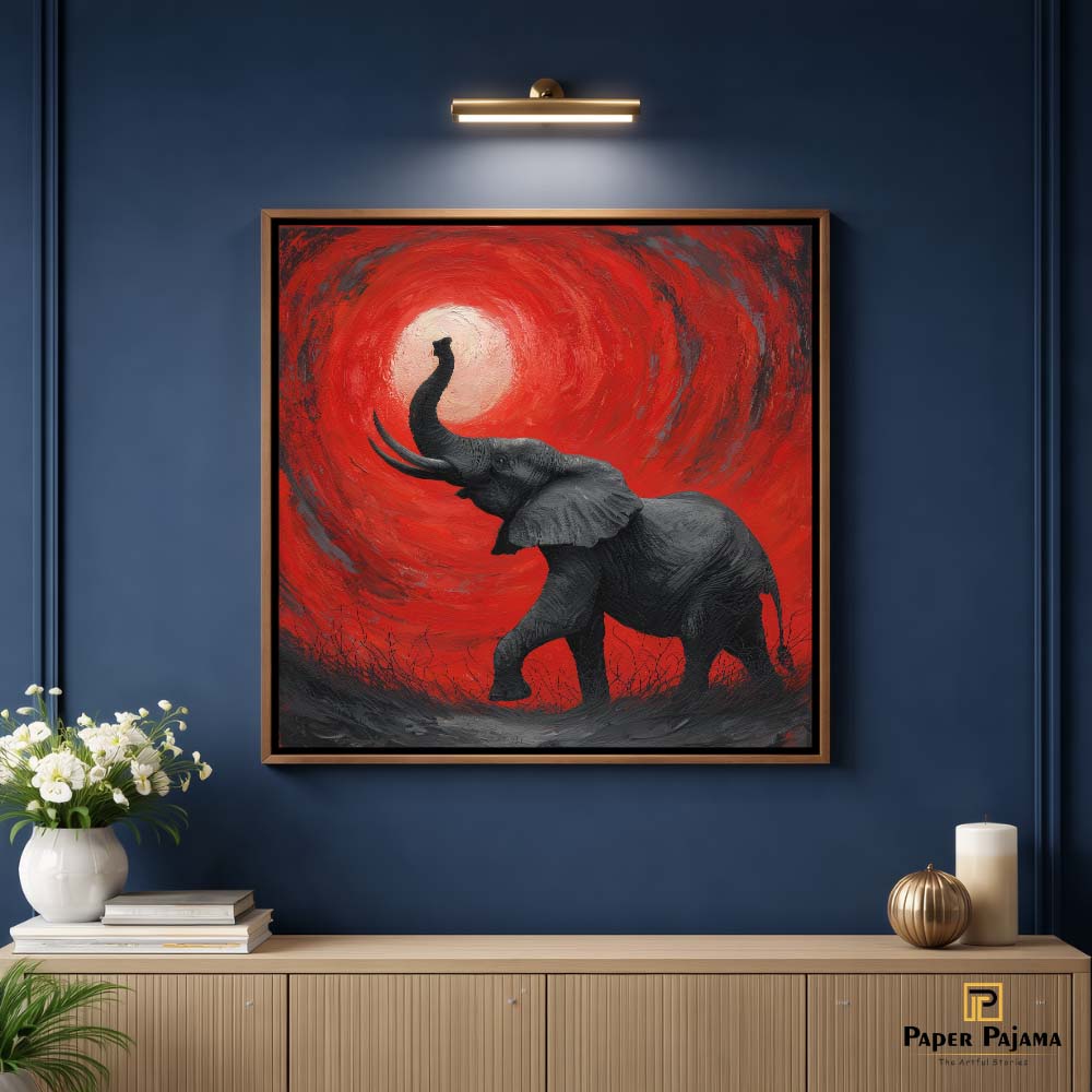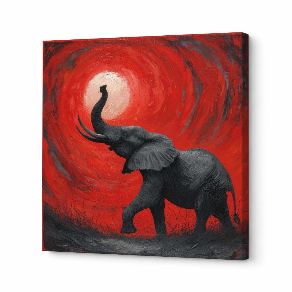 Rising Titan is a powerful depiction of raw energy, courage, and unstoppable force, featuring a lone elephant standing boldly against a swirling red backdrop. The dramatic composition captures a moment of defiance and strength, as the figure rises with intensity and purpose.