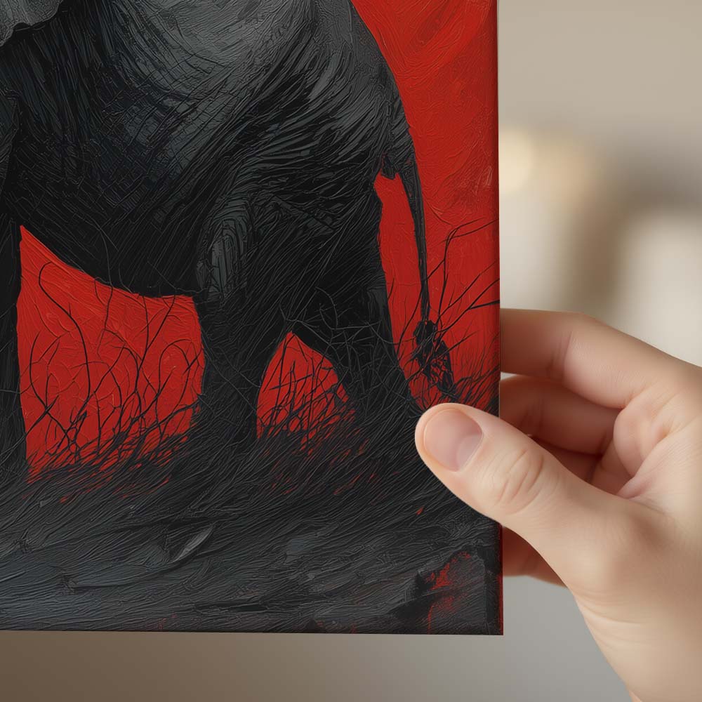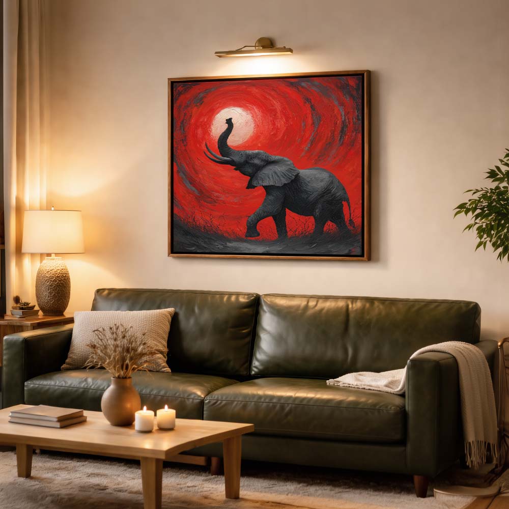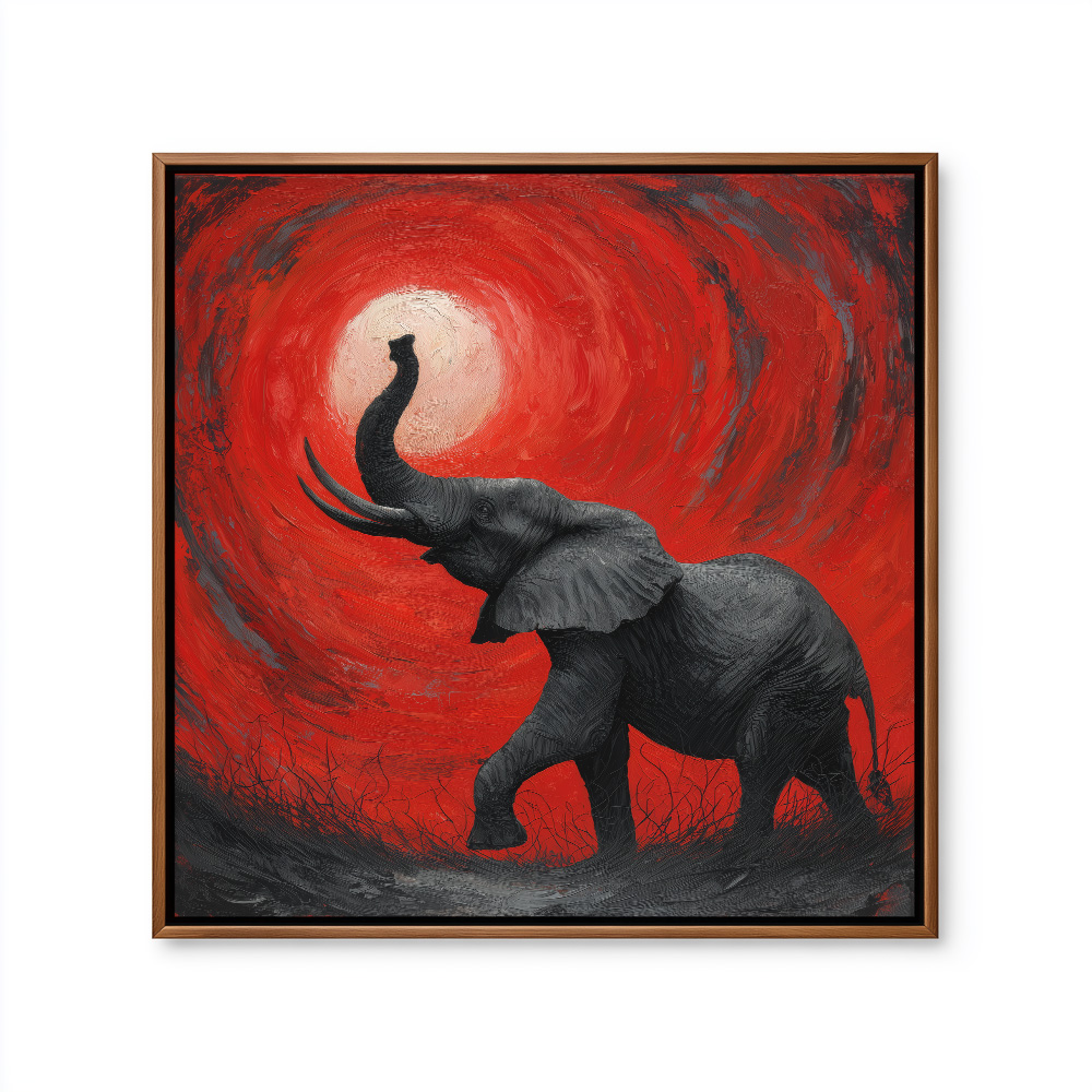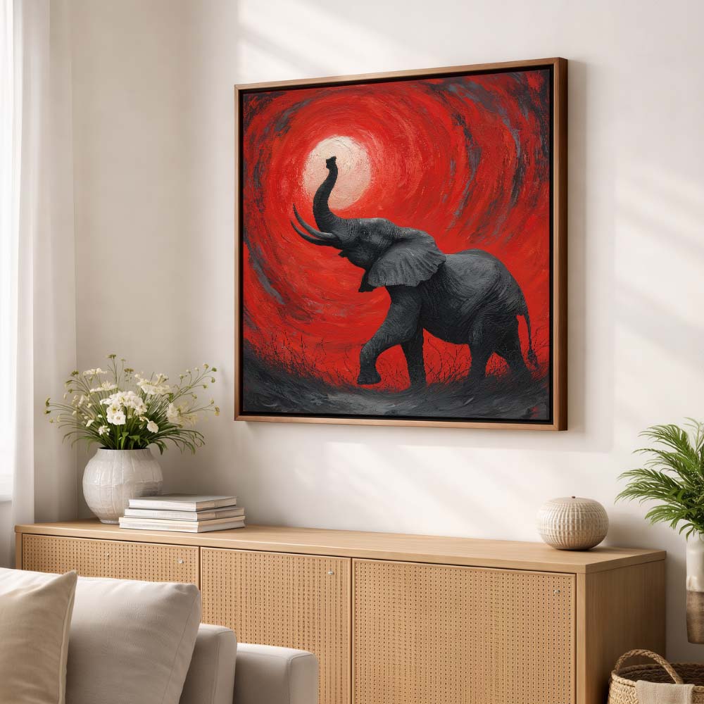 Rising Titan is a powerful depiction of raw energy, courage, and unstoppable force, featuring a lone elephant standing boldly against a swirling red backdrop. The dramatic composition captures a moment of defiance and strength, as the figure rises with intensity and purpose.