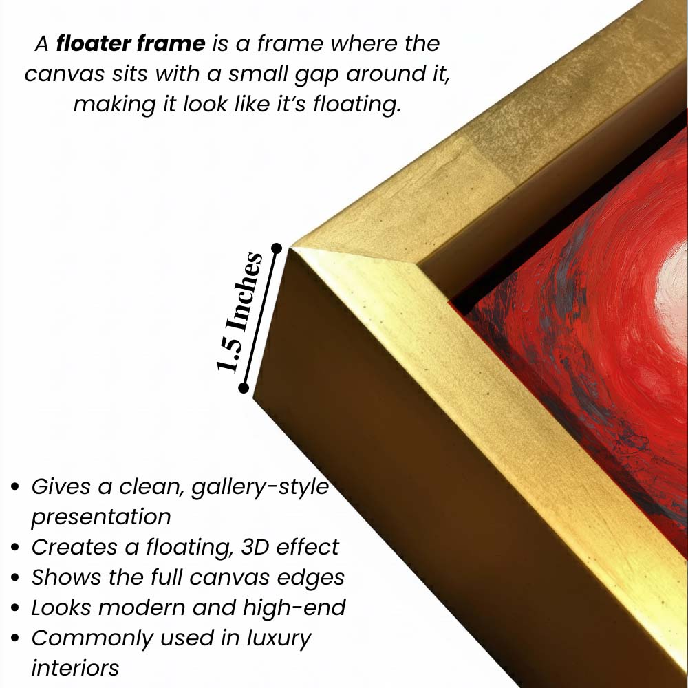 - Optional Floater Framing: Available with a premium floater frame option that creates a subtle gap between the canvas and the outer frame, enhancing depth and giving the artwork a refined, gallery-style floating effect that elevates its visual appeal.