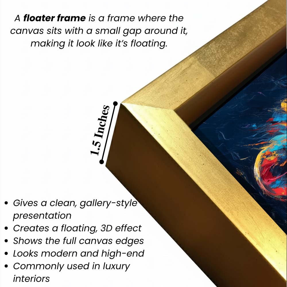 - Optional Floater Framing: Available with a premium floater frame option that creates a subtle gap between the canvas and the outer frame, enhancing depth and giving the artwork a refined, gallery-style floating effect that elevates its visual appeal.