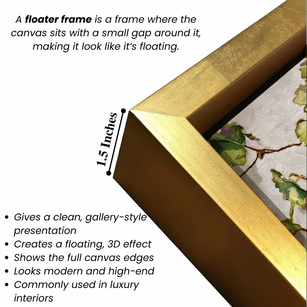 - Optional Floater Framing: Available with a premium floater frame option that creates a subtle gap between the canvas and the outer frame, enhancing depth and giving the artwork a refined, gallery-style floating effect that elevates its visual appeal.