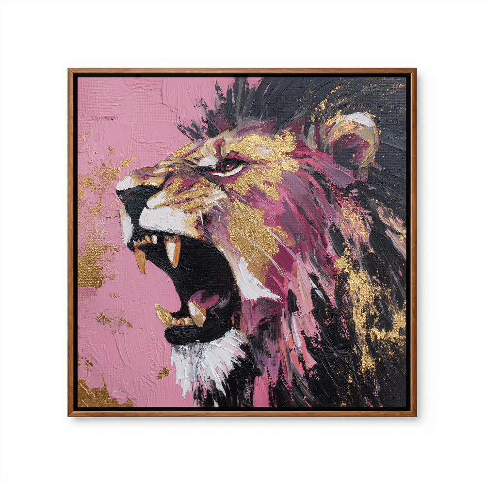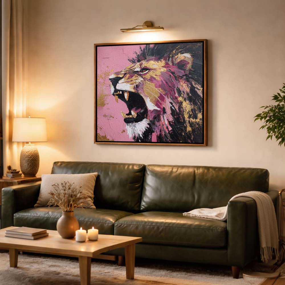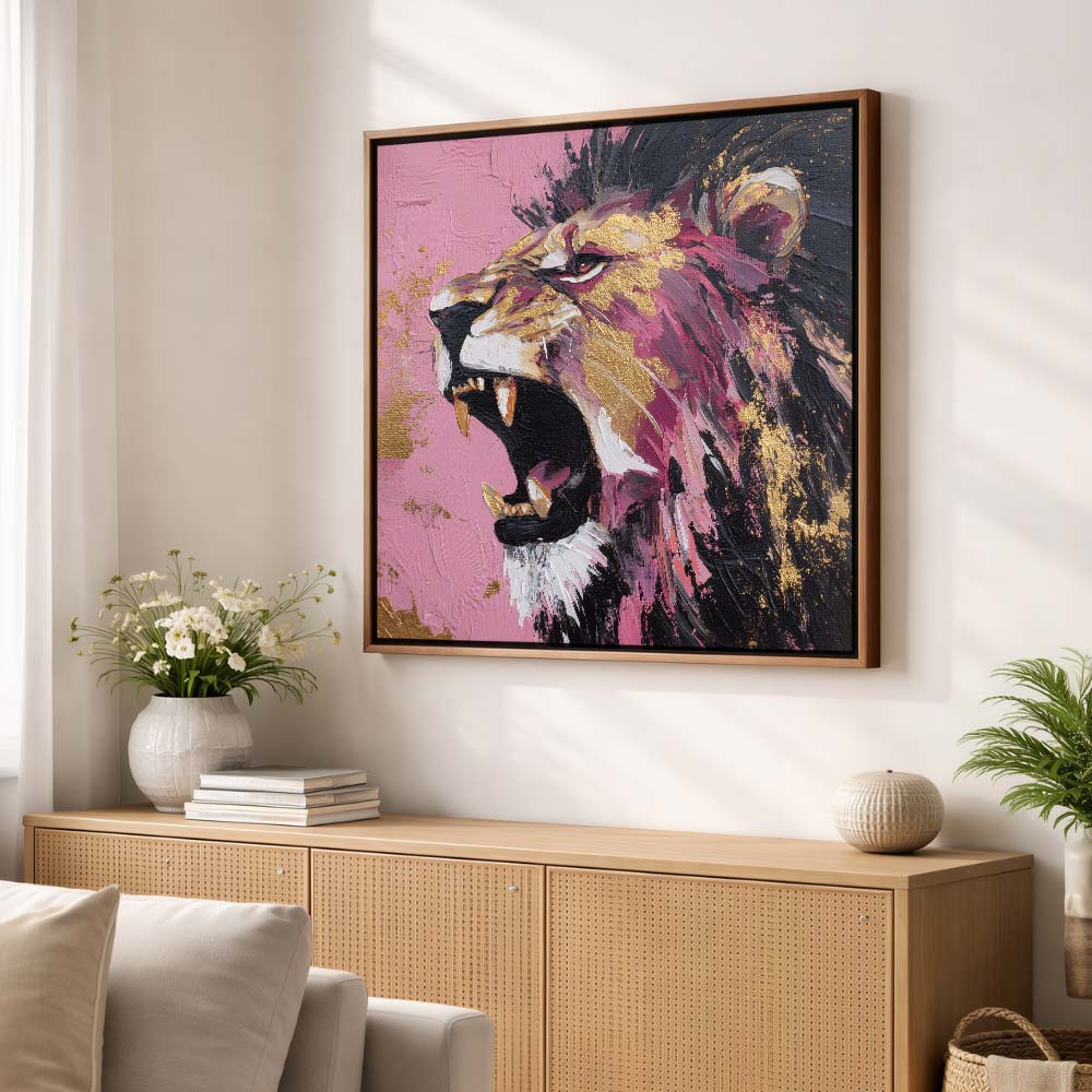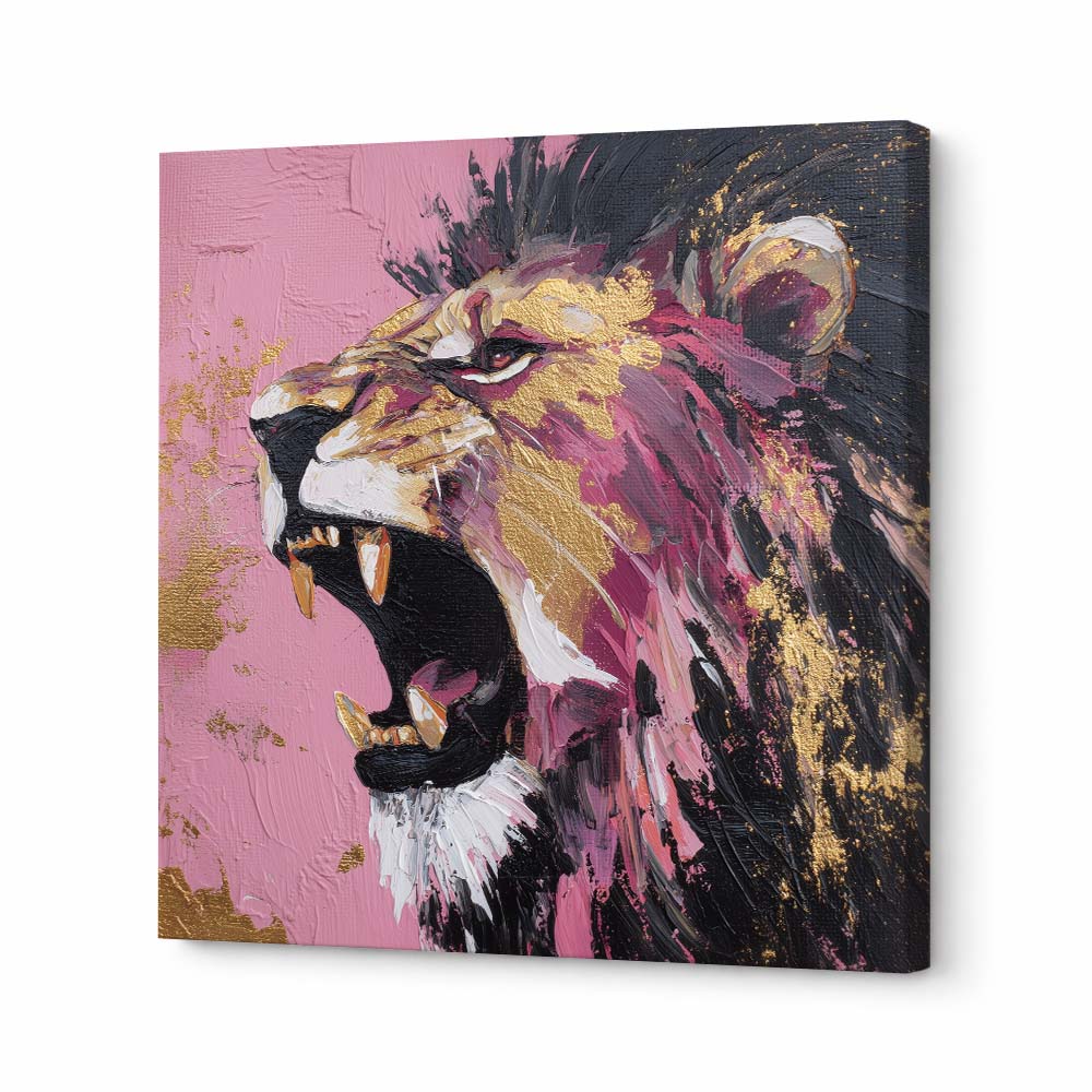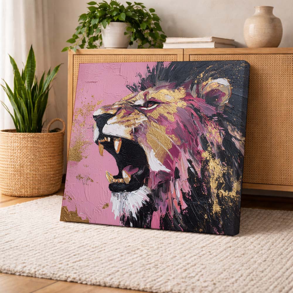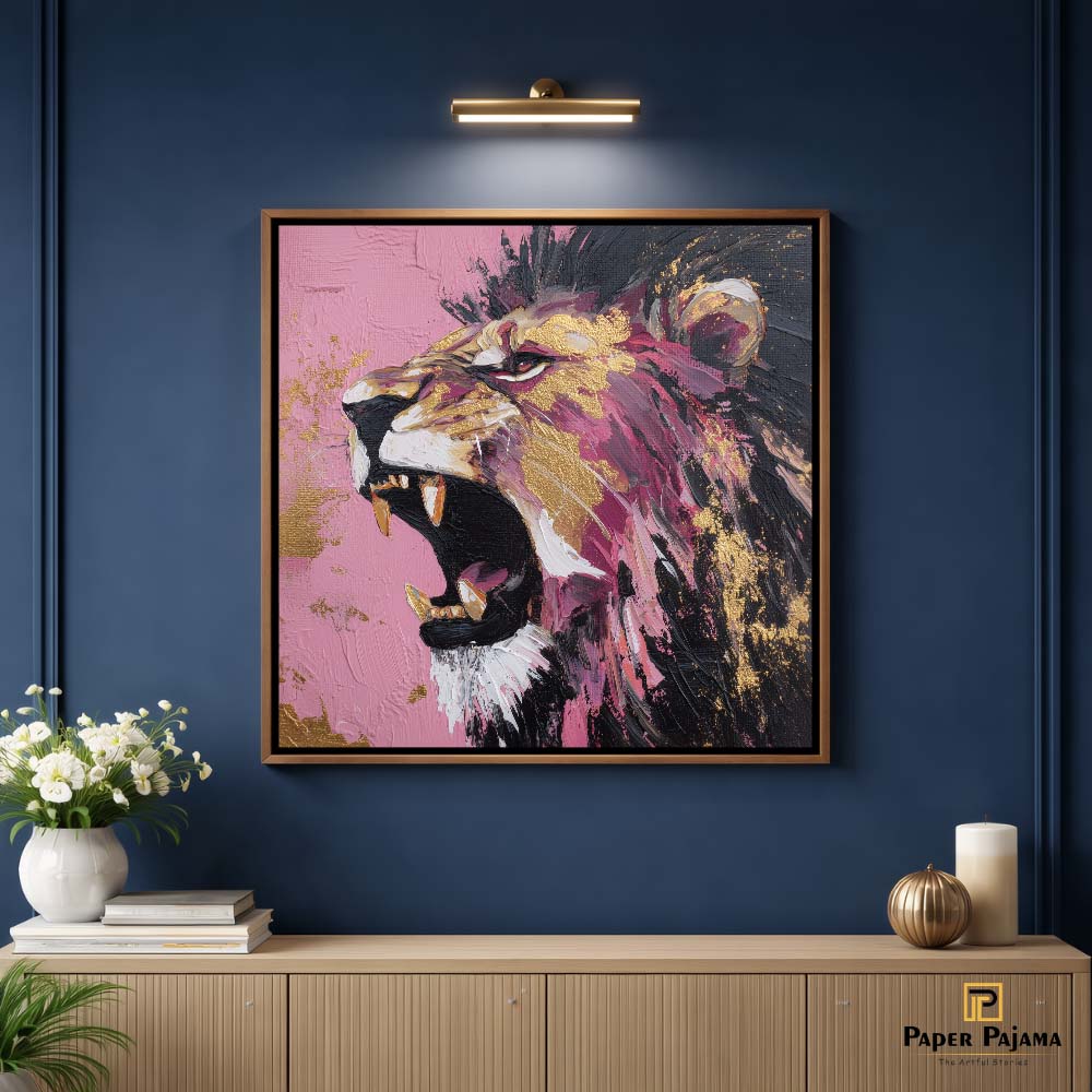 The rich tones and dynamic textures create a sense of force and momentum, making the lion appear alive and commanding. The composition conveys courage, authority, and untamed power.