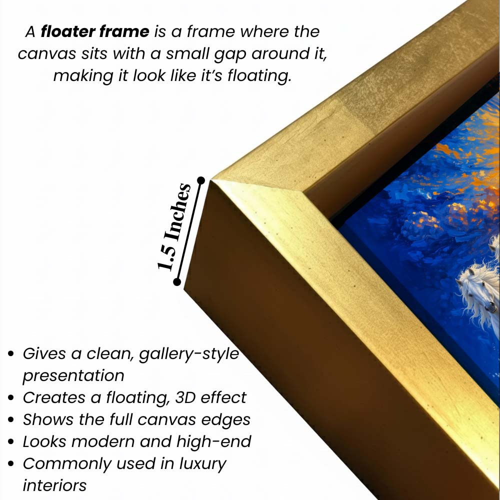 - Optional Floater Framing: Available with a premium floater frame option that creates a subtle gap between the canvas and the outer frame, enhancing depth and giving the artwork a refined, gallery-style floating effect that elevates its visual appeal.