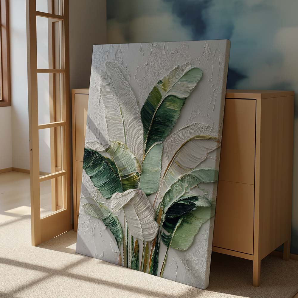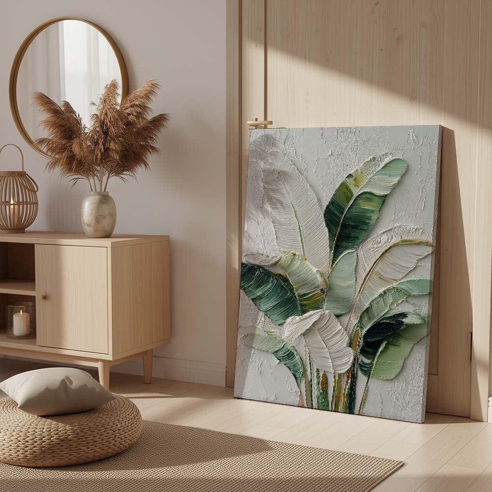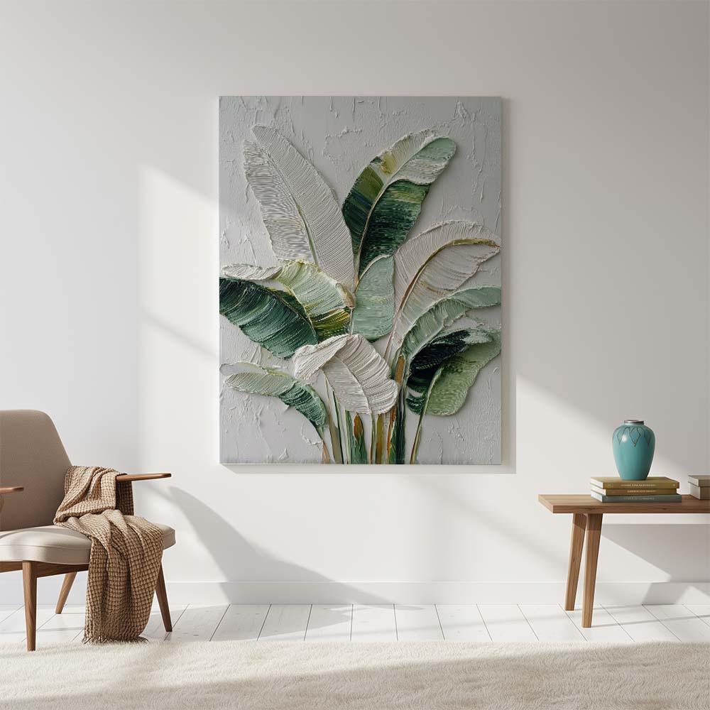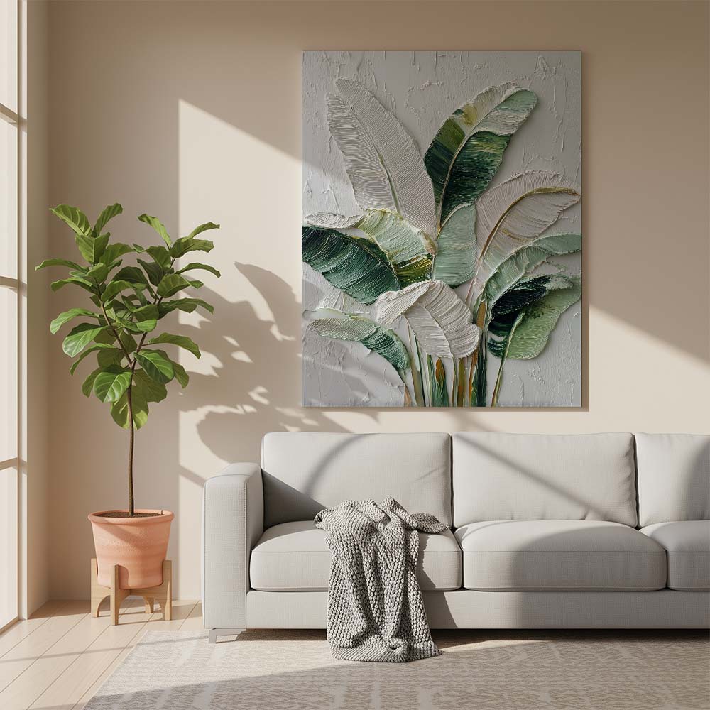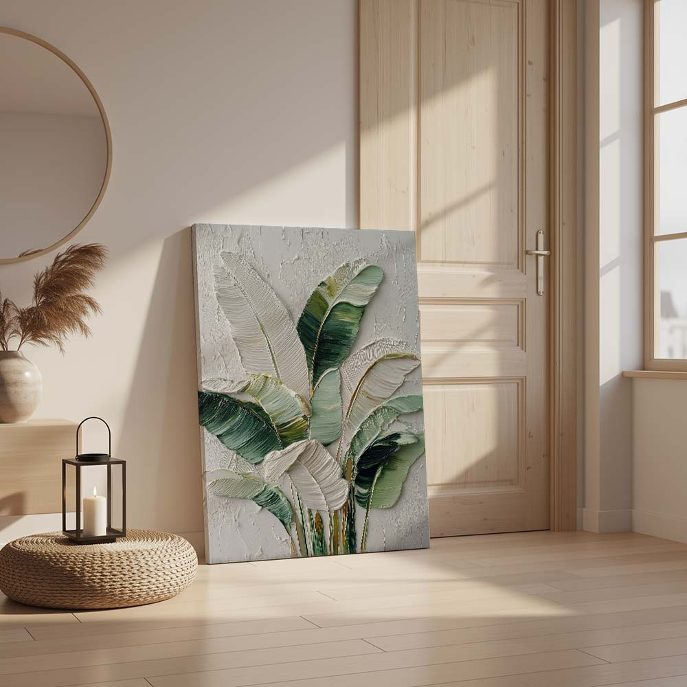 The blend of greens with light neutrals adds depth while maintaining a serene and airy feel. The composition feels fresh yet grounded, offering a subtle connection to nature.