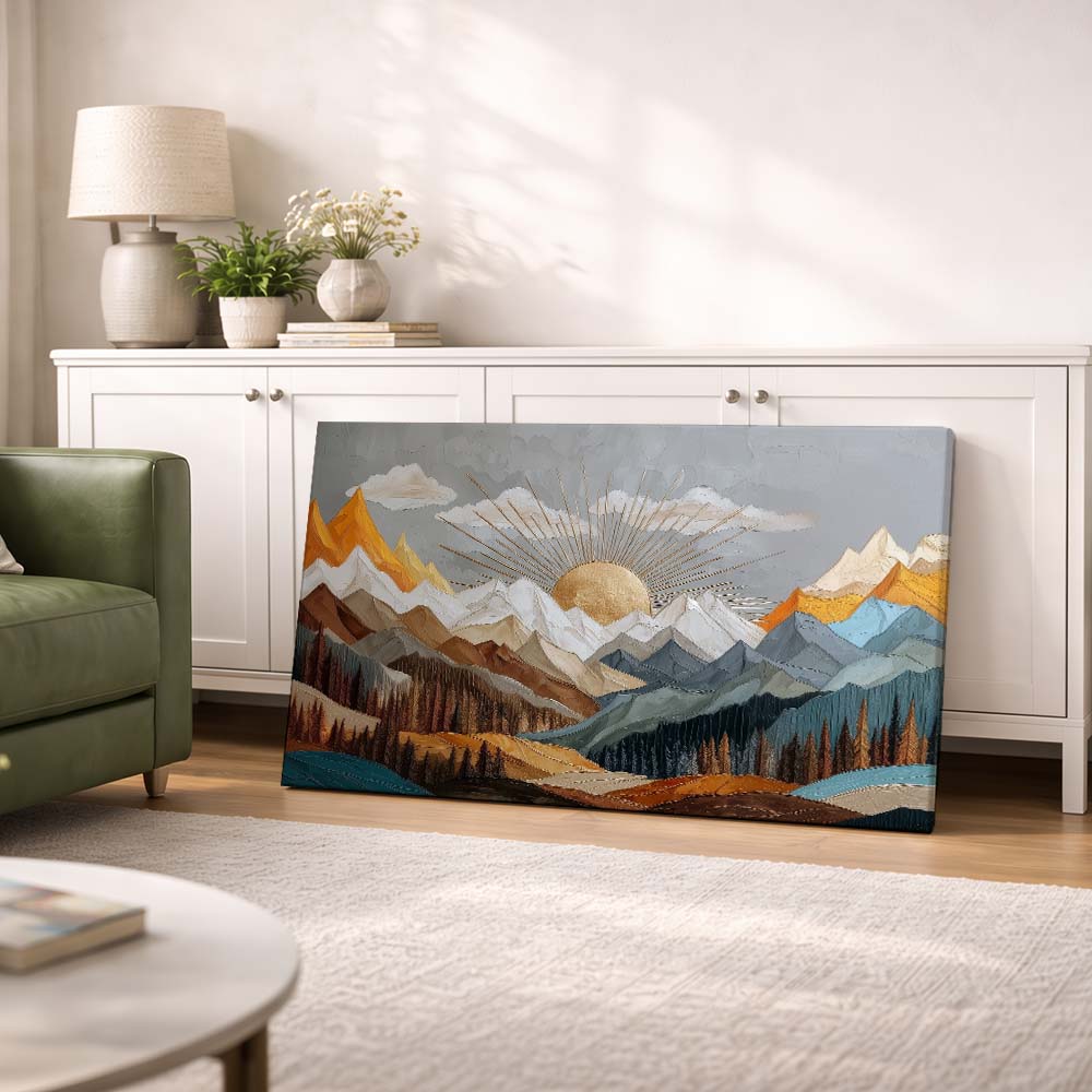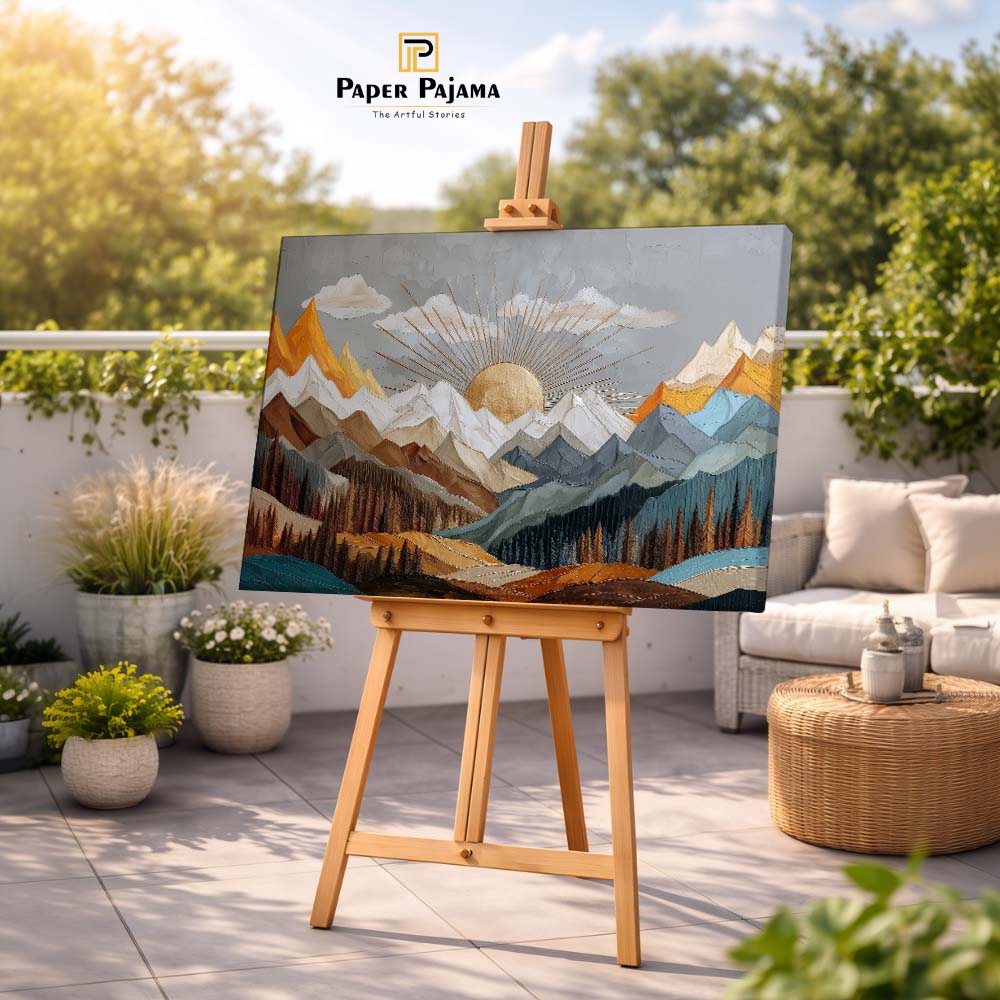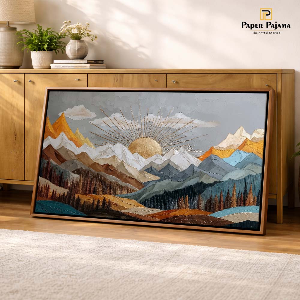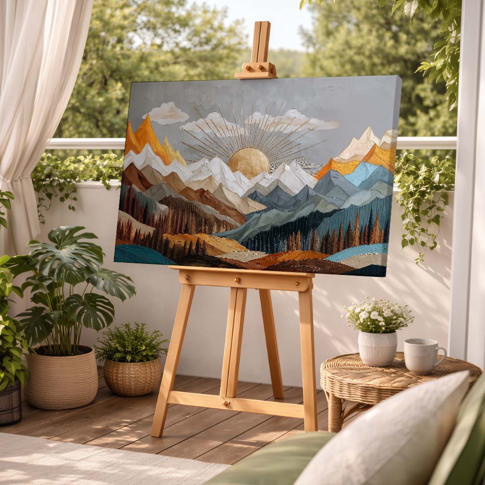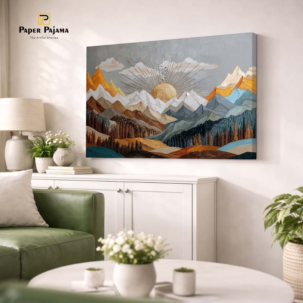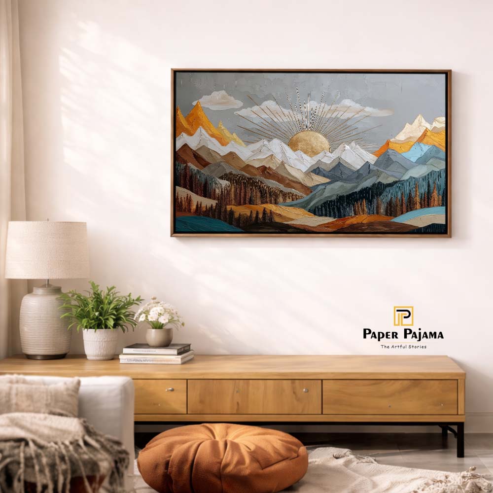 Solar Majesty is a grand and radiant depiction of nature’s brilliance, capturing a glowing sun rising above majestic mountains. The artwork reflects strength, renewal, and the powerful rhythm of the natural world.