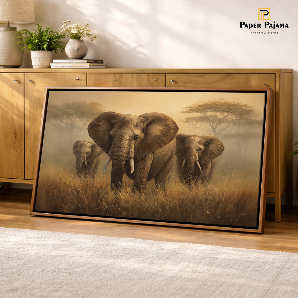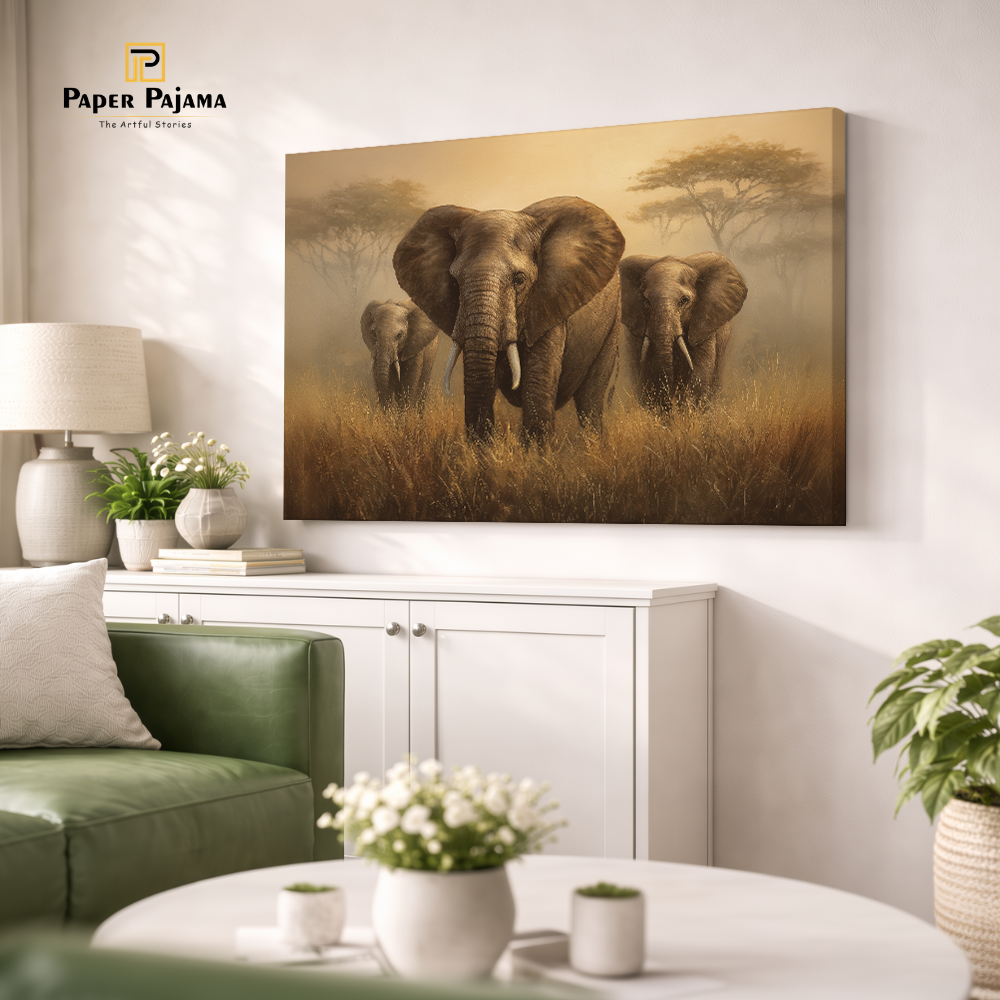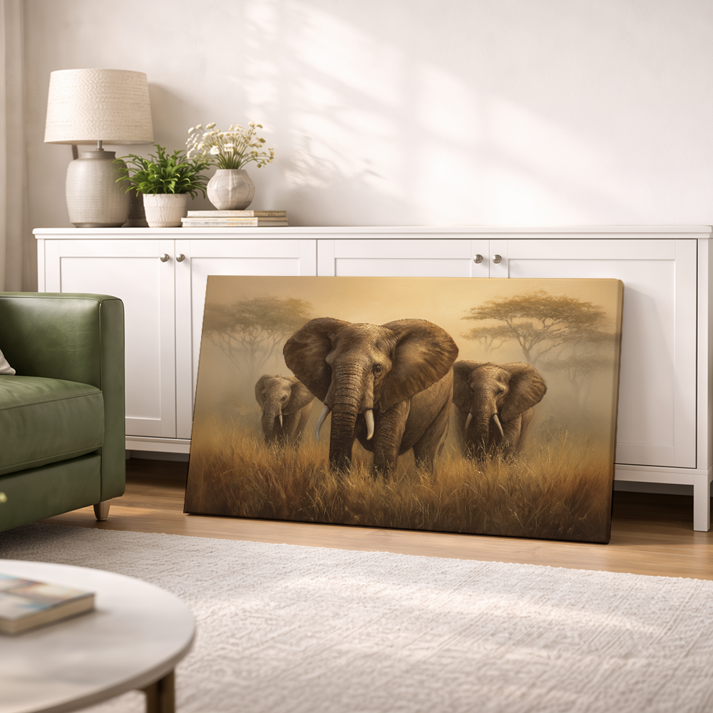 A trio of elephants moves calmly through a golden savanna, their presence both powerful and serene. Soft sunlight filters through a hazy backdrop, highlighting the texture of their skin and the gentle sway of the tall grass. The composition captures a quiet moment of unity and strength, evoking a deep connection to nature. Subtle tones and warm hues create a tranquil, almost timeless atmosphere.