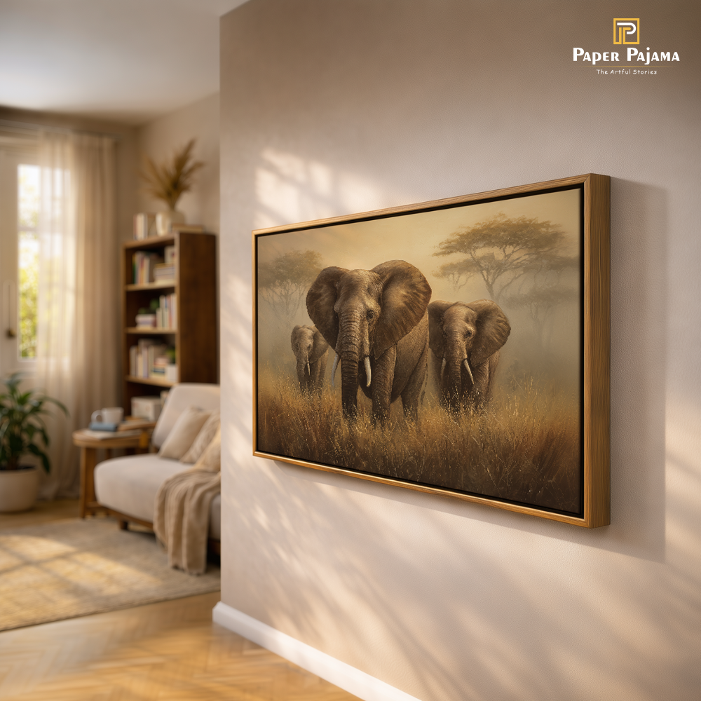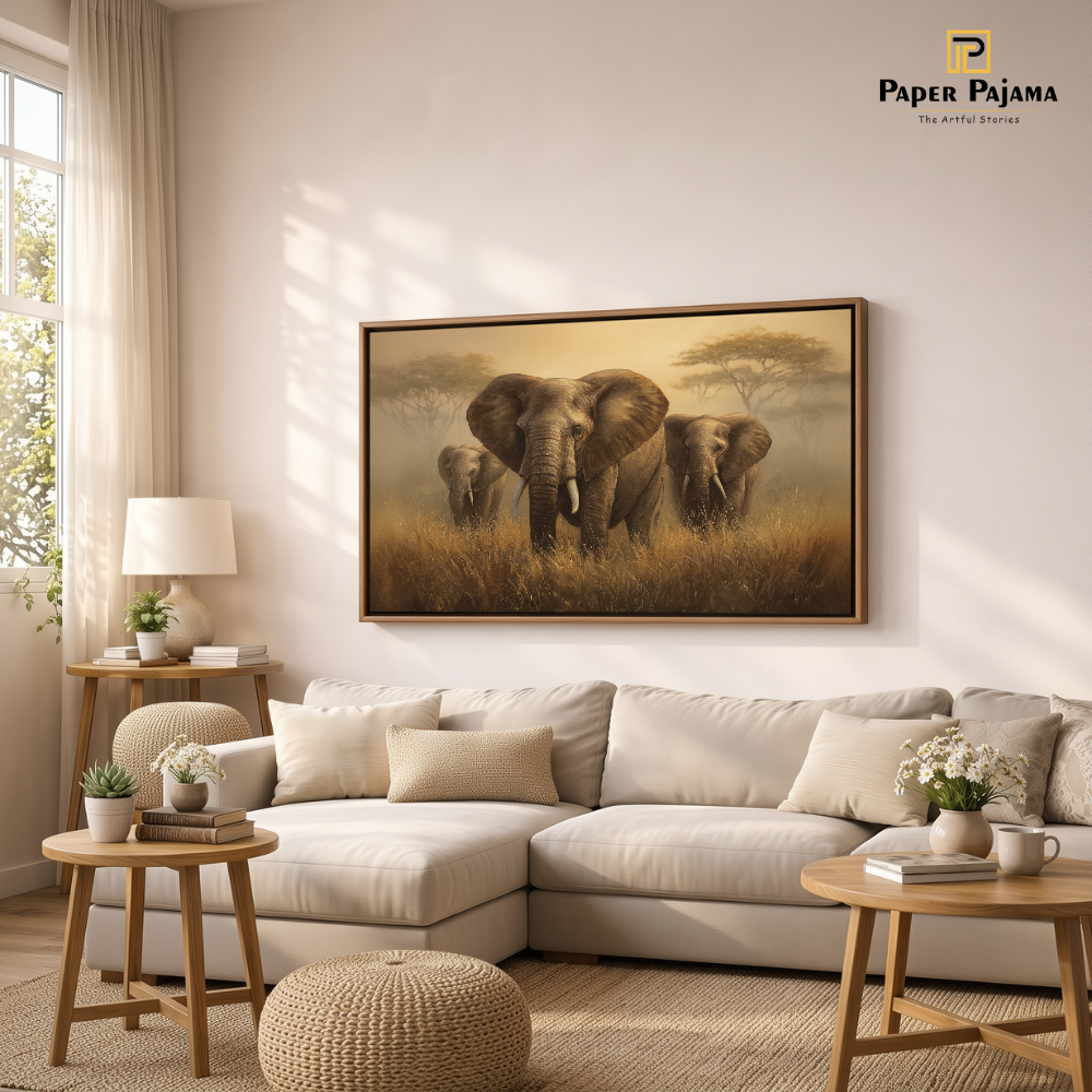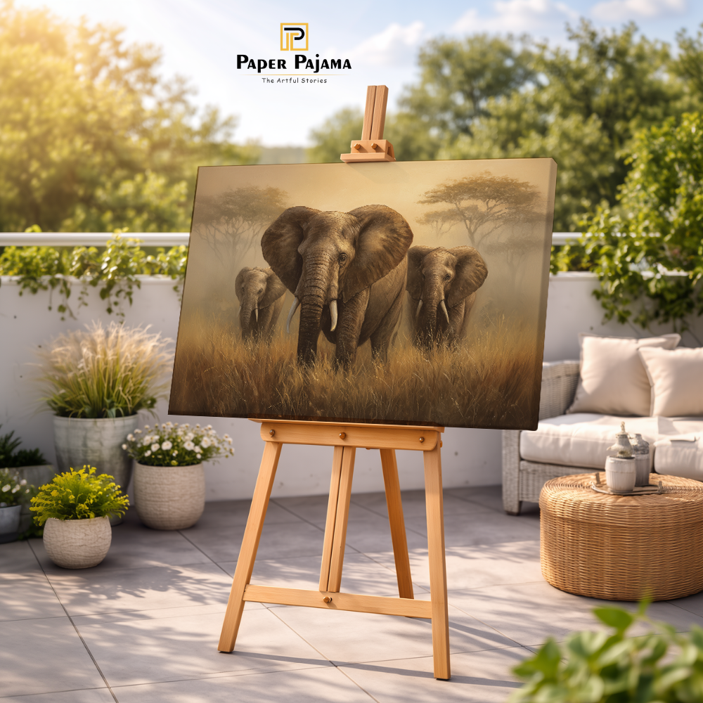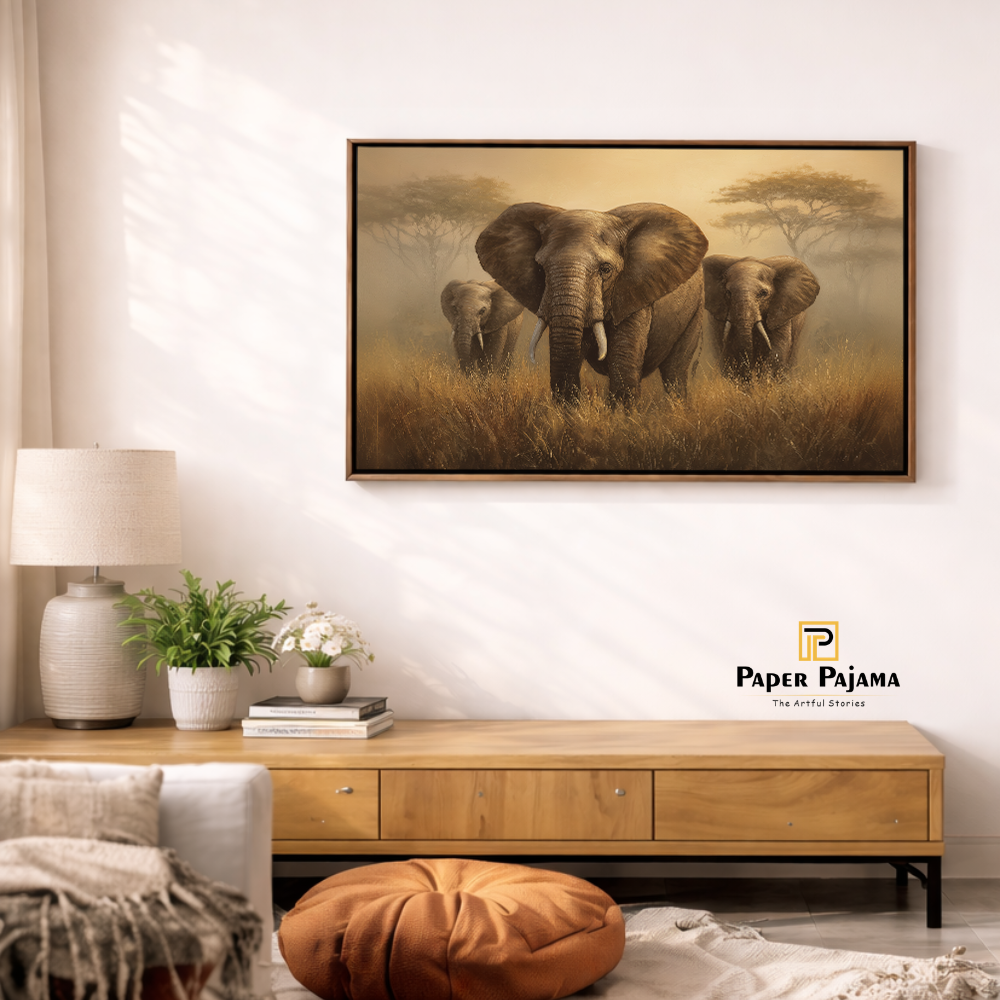 A trio of elephants moves calmly through a golden savanna, their presence both powerful and serene. Soft sunlight filters through a hazy backdrop, highlighting the texture of their skin and the gentle sway of the tall grass. The composition captures a quiet moment of unity and strength, evoking a deep connection to nature. Subtle tones and warm hues create a tranquil, almost timeless atmosphere.