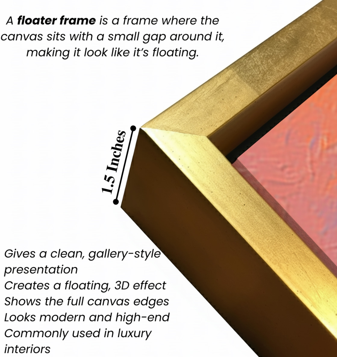 - Optional Floater Framing: Available with a premium floater frame option that creates a subtle gap between the canvas and the outer frame, enhancing depth and giving the artwork a refined, gallery-style floating effect that elevates its visual appeal.