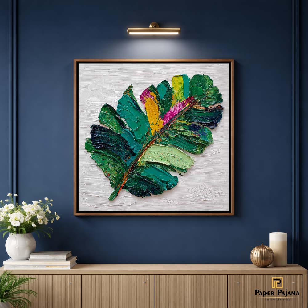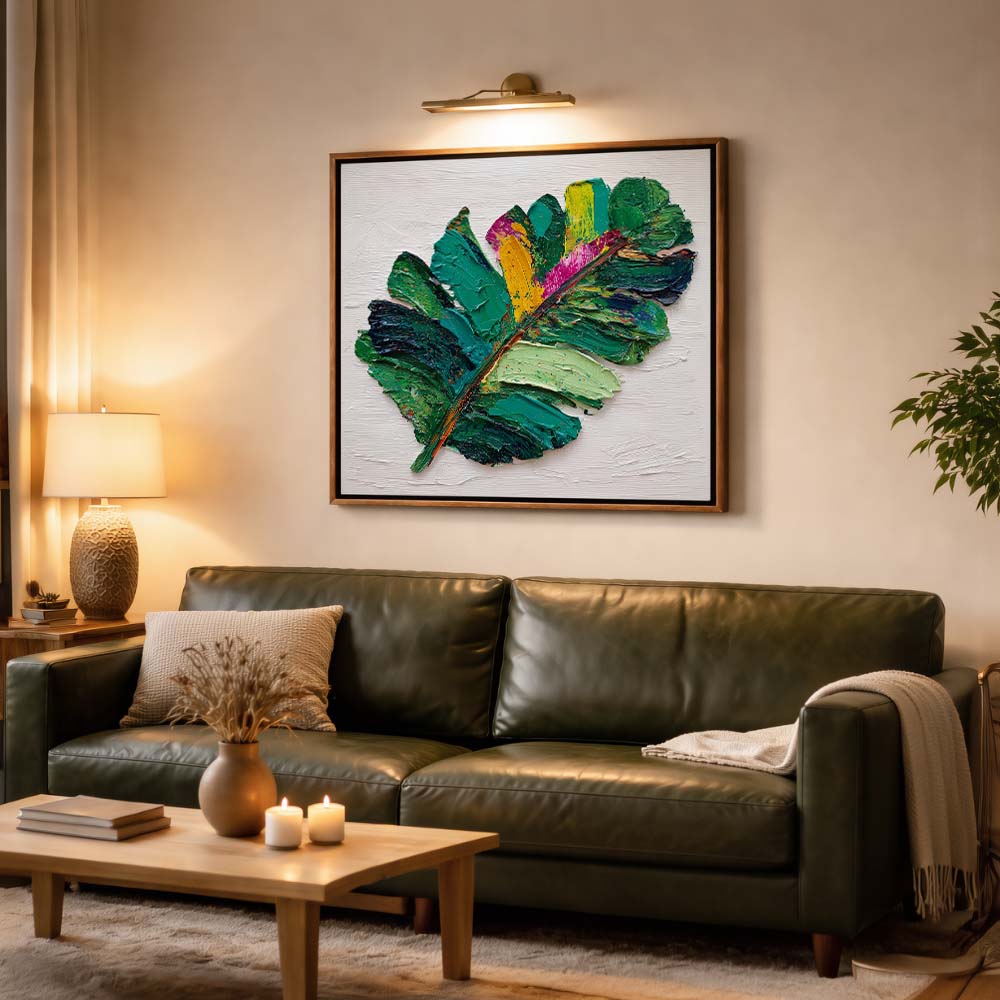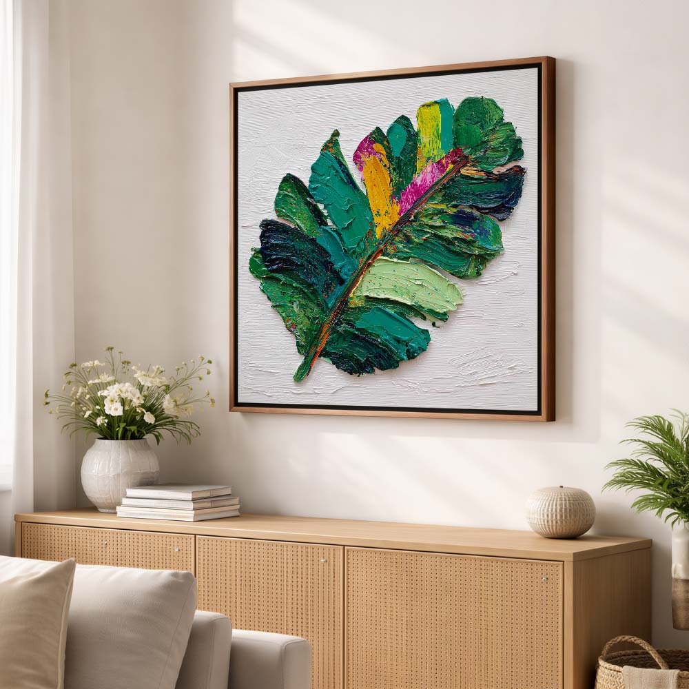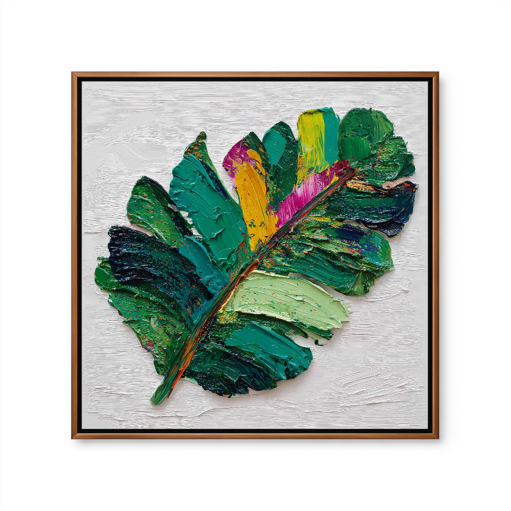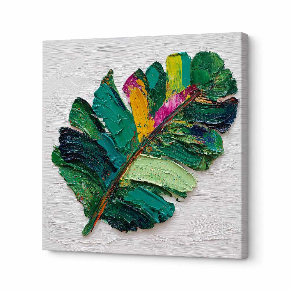 Vivid Leaf is a bold and expressive artwork that transforms a single leaf into a striking statement of color and texture. The composition features rich, saturated hues—greens, yellows, and subtle accents—layered with dynamic brushwork that gives the leaf a sculptural presence.