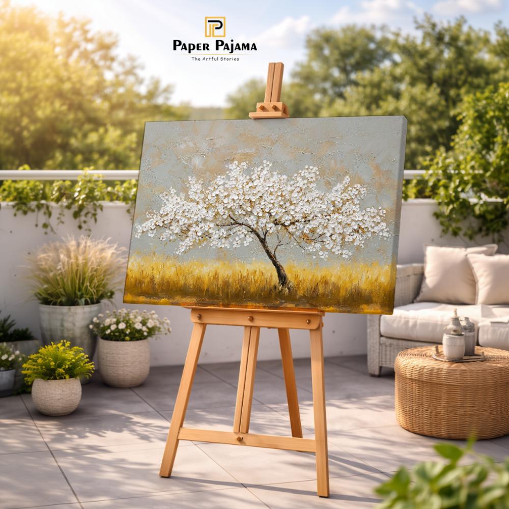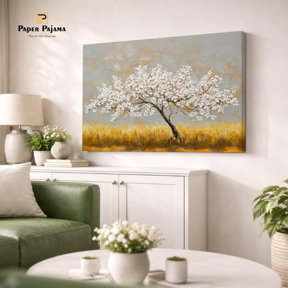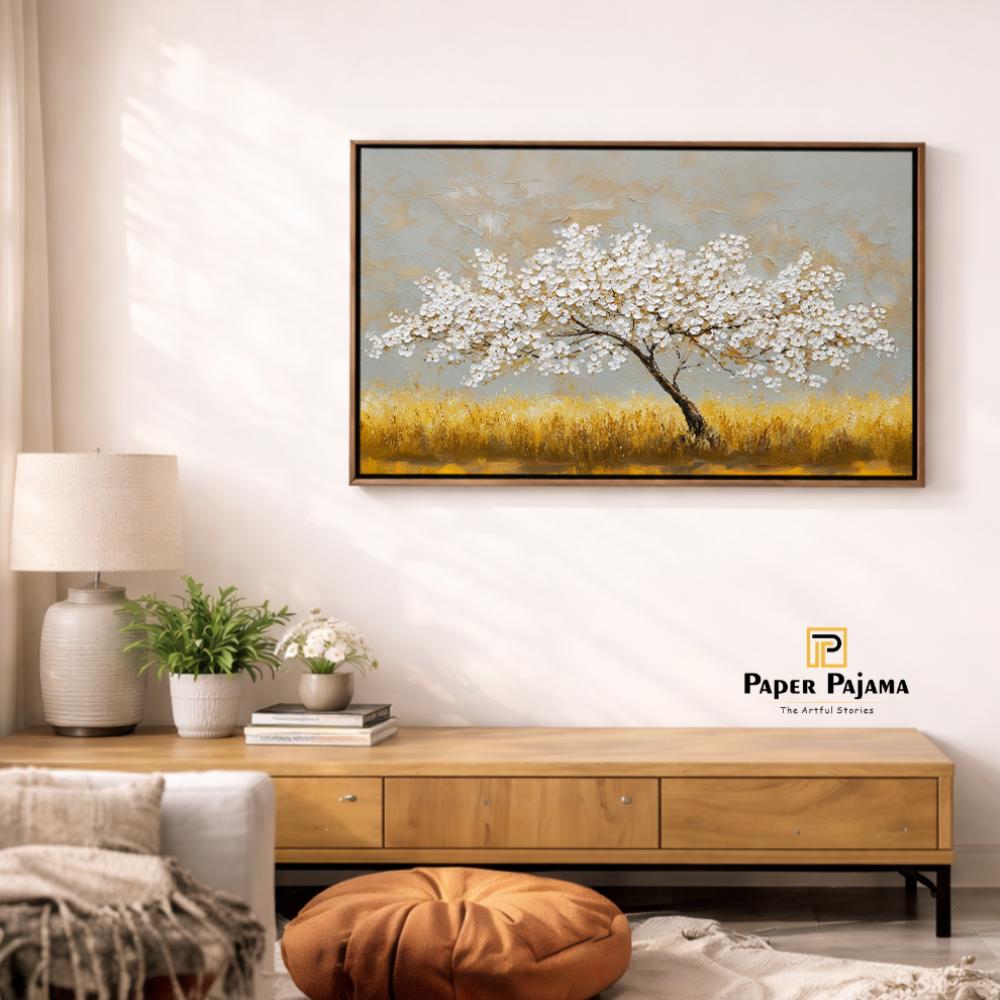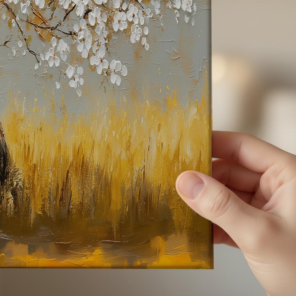 Yellow Horizon is a radiant landscape that captures the warmth and quiet beauty of a golden field beneath a soft sky. A solitary tree stands gracefully against the glowing horizon, symbolizing peace, stability, and gentle strength.