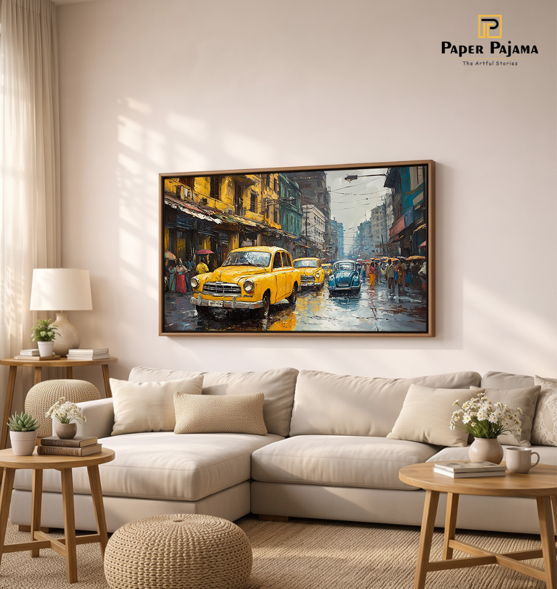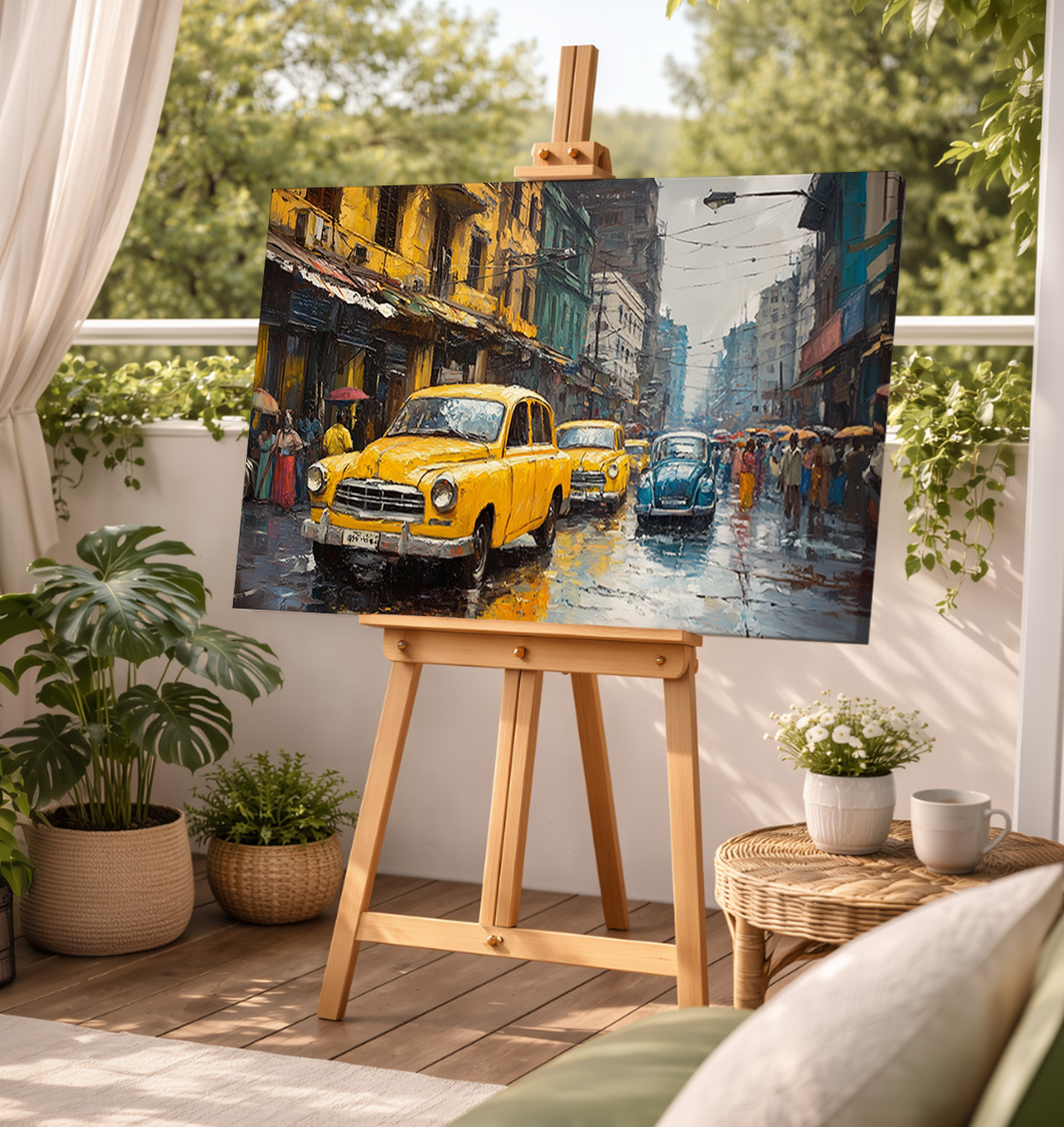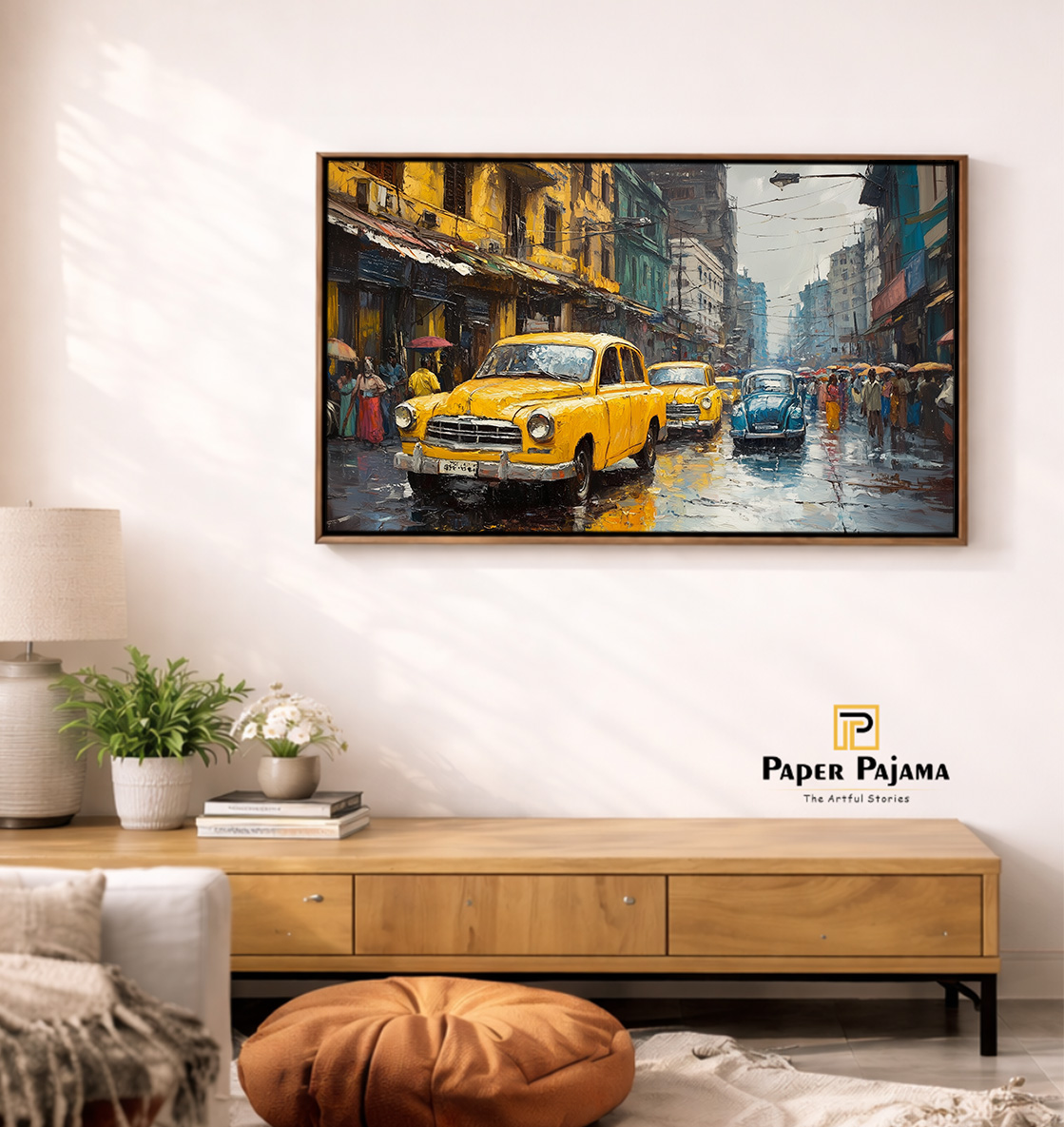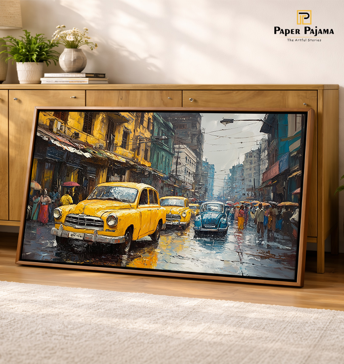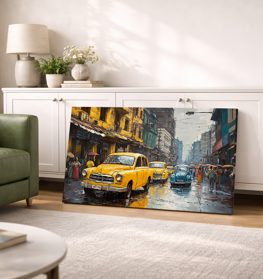 Yellow Taxi captures the pulse of a bustling city street washed in monsoon rain and golden nostalgia. This striking printed artwork portrays iconic vintage taxis moving through a lively urban lane, where reflections shimmer on rain-soaked roads and everyday life unfolds beneath umbrellas and weathered facades. The composition feels cinematic, energetic, and deeply rooted in timeless city charm.