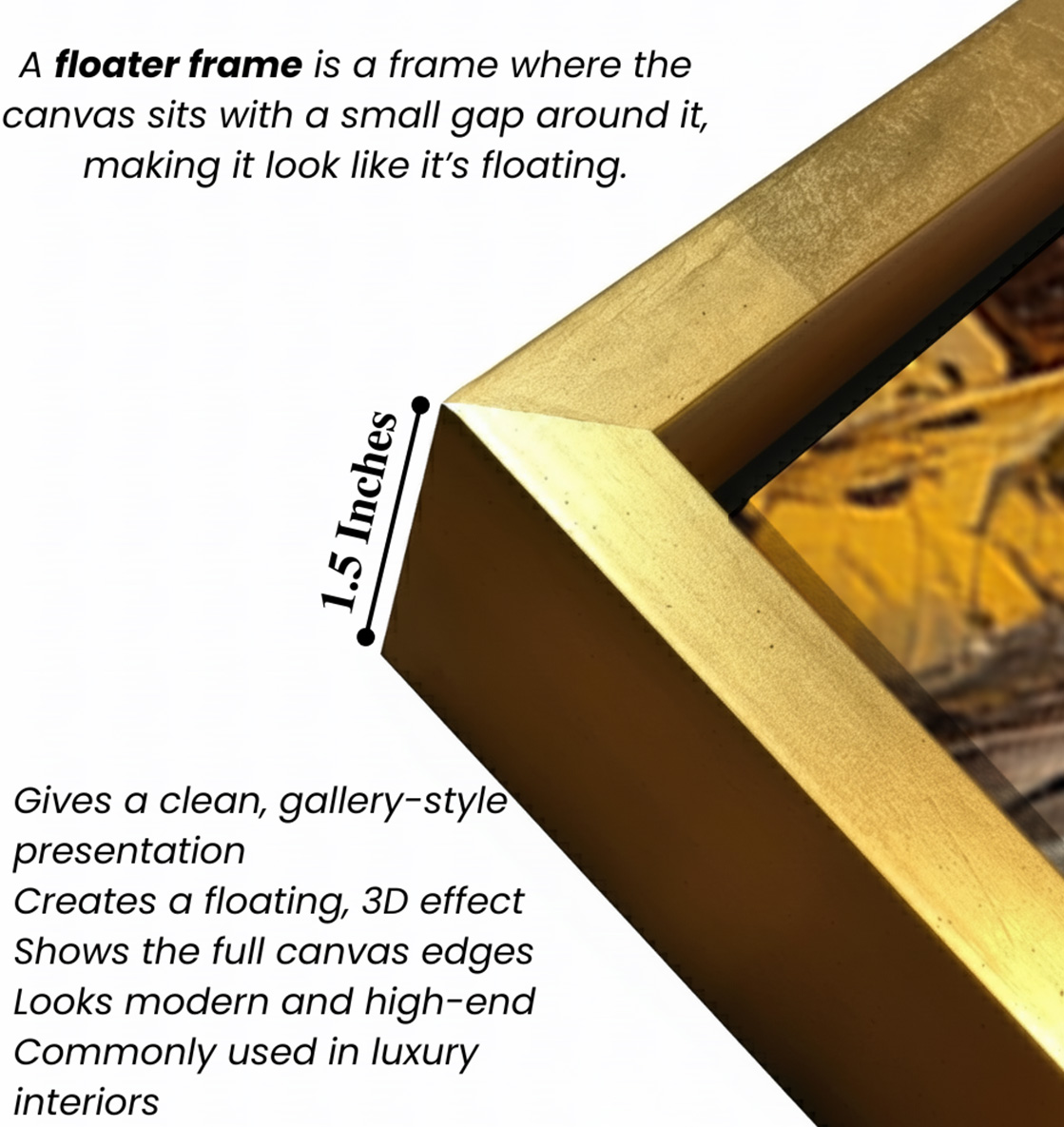 • Optional Floater Framing: Available with a premium floater frame option that creates a subtle gap between the canvas and the outer frame, enhancing depth and giving the artwork a refined, gallery-style floating effect that elevates its visual appeal.